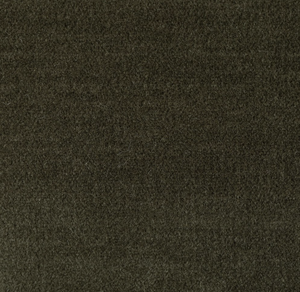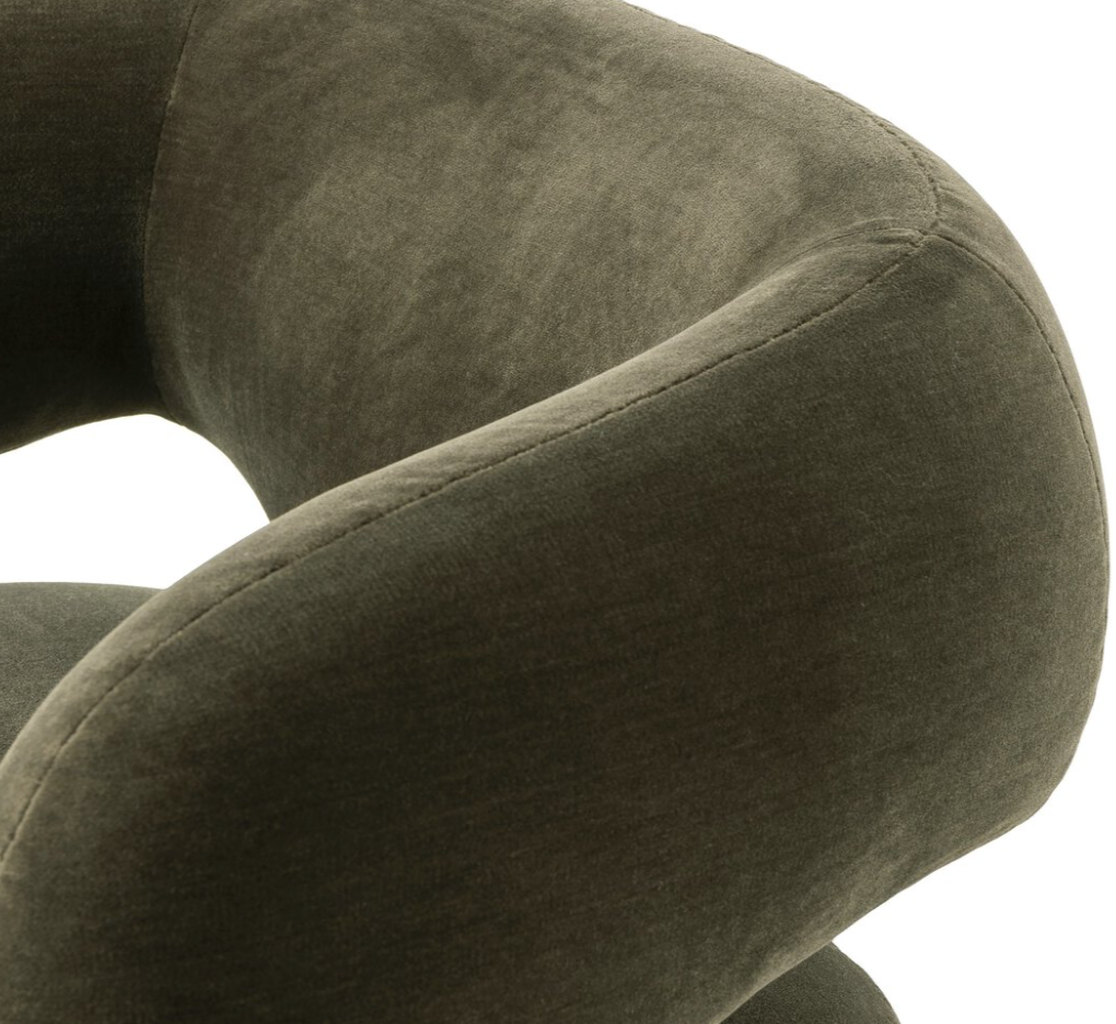 A fluid play on seating. This statement-making swivel chair features subtle cutouts on the back, with plush arms that hug the seat. Upholstered in an olive faux wool-mohair, bringing a plush moment to a classic frame.