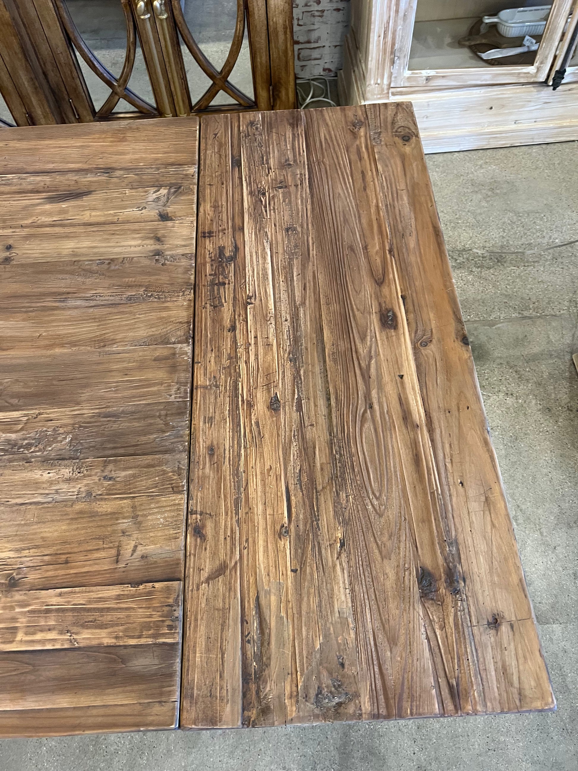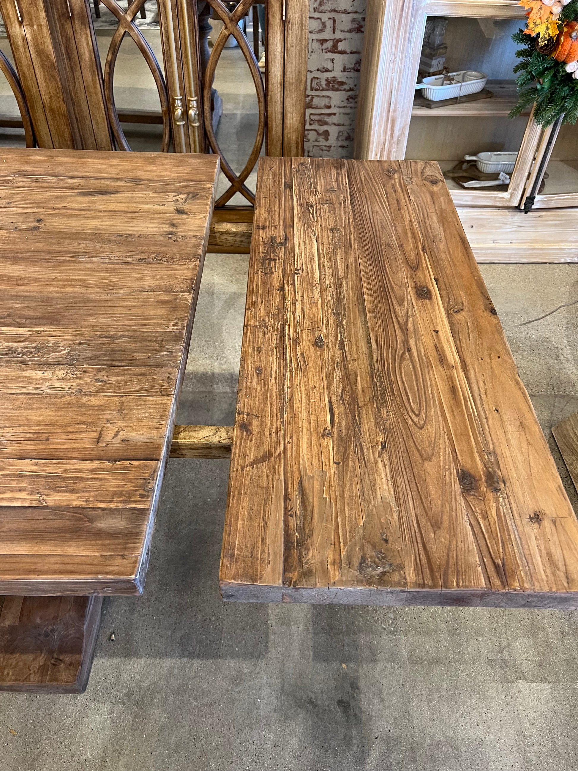 Solid reclaimed pine wood dining table in medium natural finish with classic trestle
