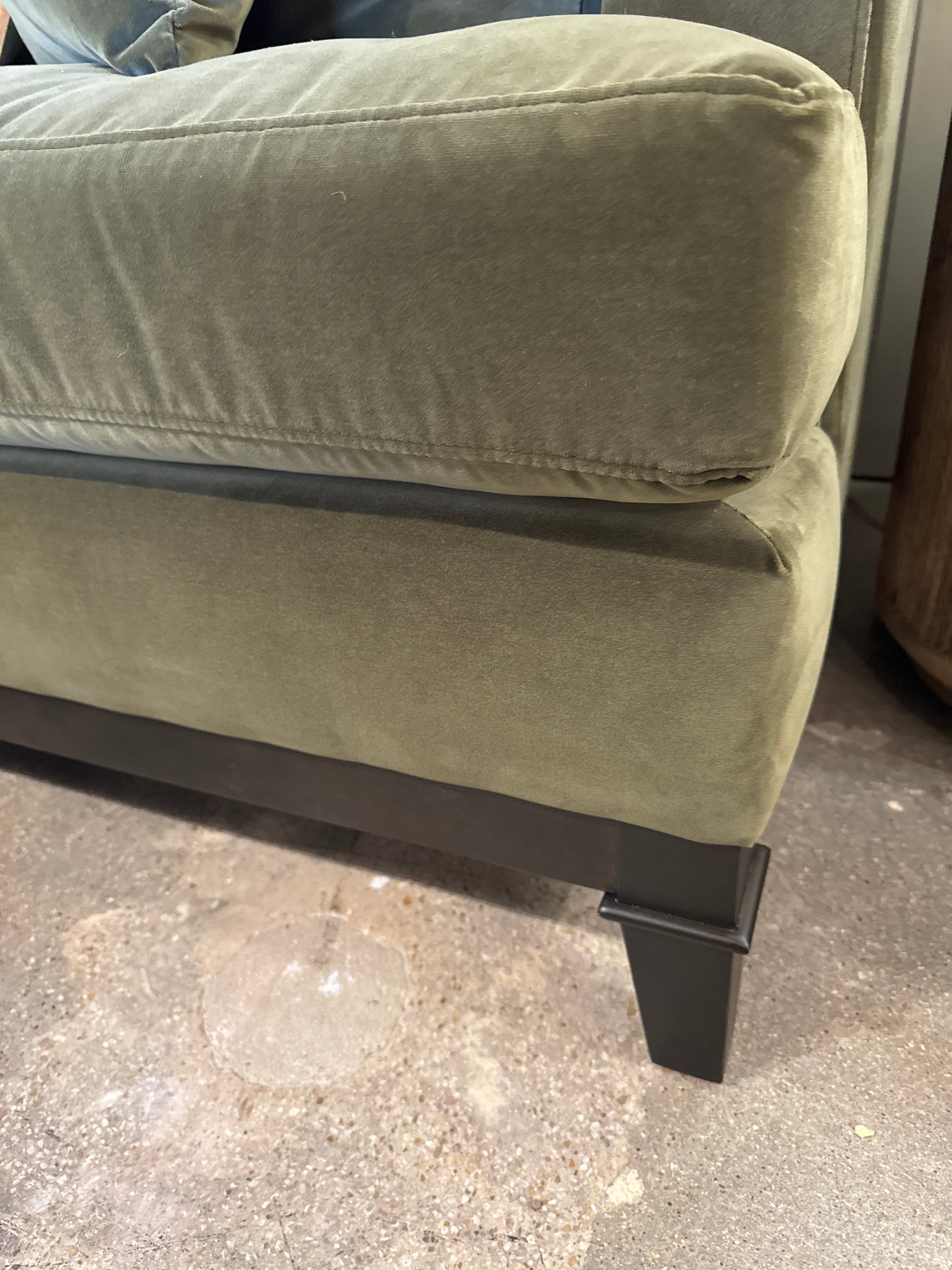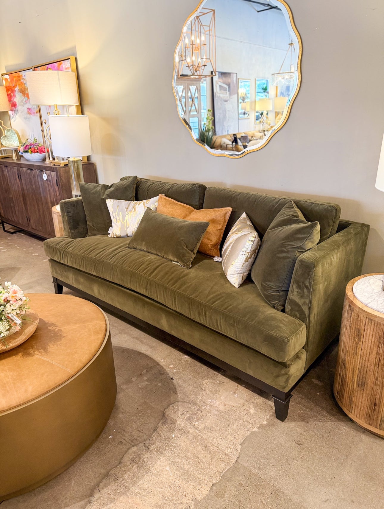 Indulge in luxury with the Ames 82" Sofa in Vintage Velvet Olive. The stunning, rich, performance velvet in a striking olive green pairs beautifully with its elegant walnut wood trim. This transitional statement piece boasts luxurious down-filled back cushions, paired with a cold spring foam singular base cushion, for the ultimate in comfort and style. No matter where you put it, this sofa is sure to reel in second glances!