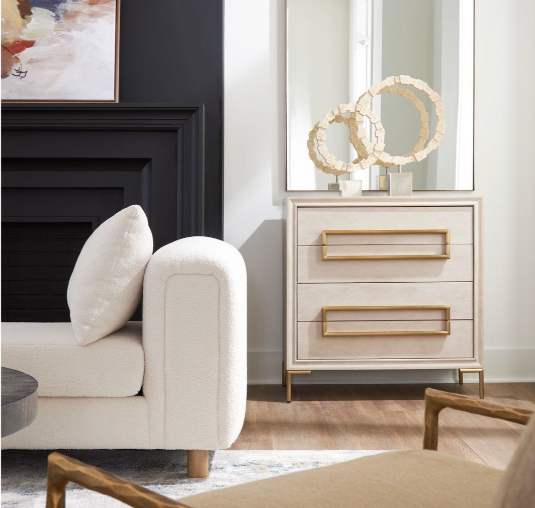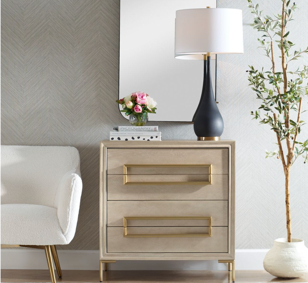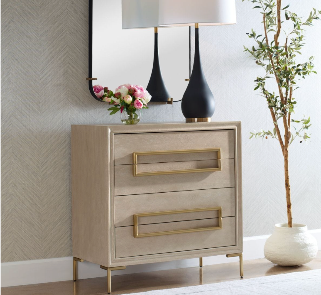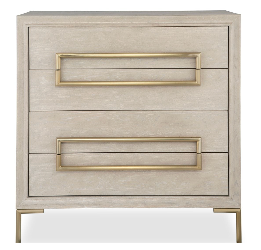 Showcasing a fresh contemporary look, the Alessia accent chest exhibits a light oak veneer adding a touch of brightness to any room. Its stylish appeal is elevated with brushed brass plated stainless steel hardware and legs, with four soft closing drawers.