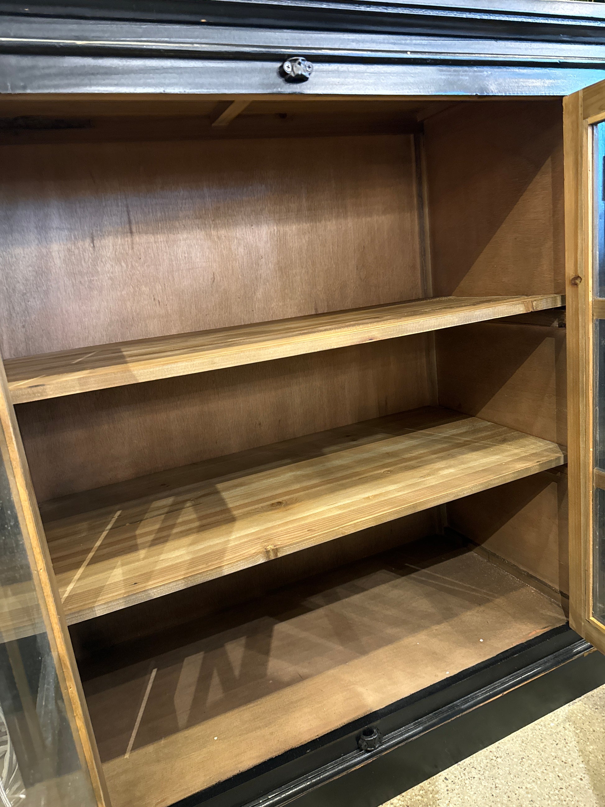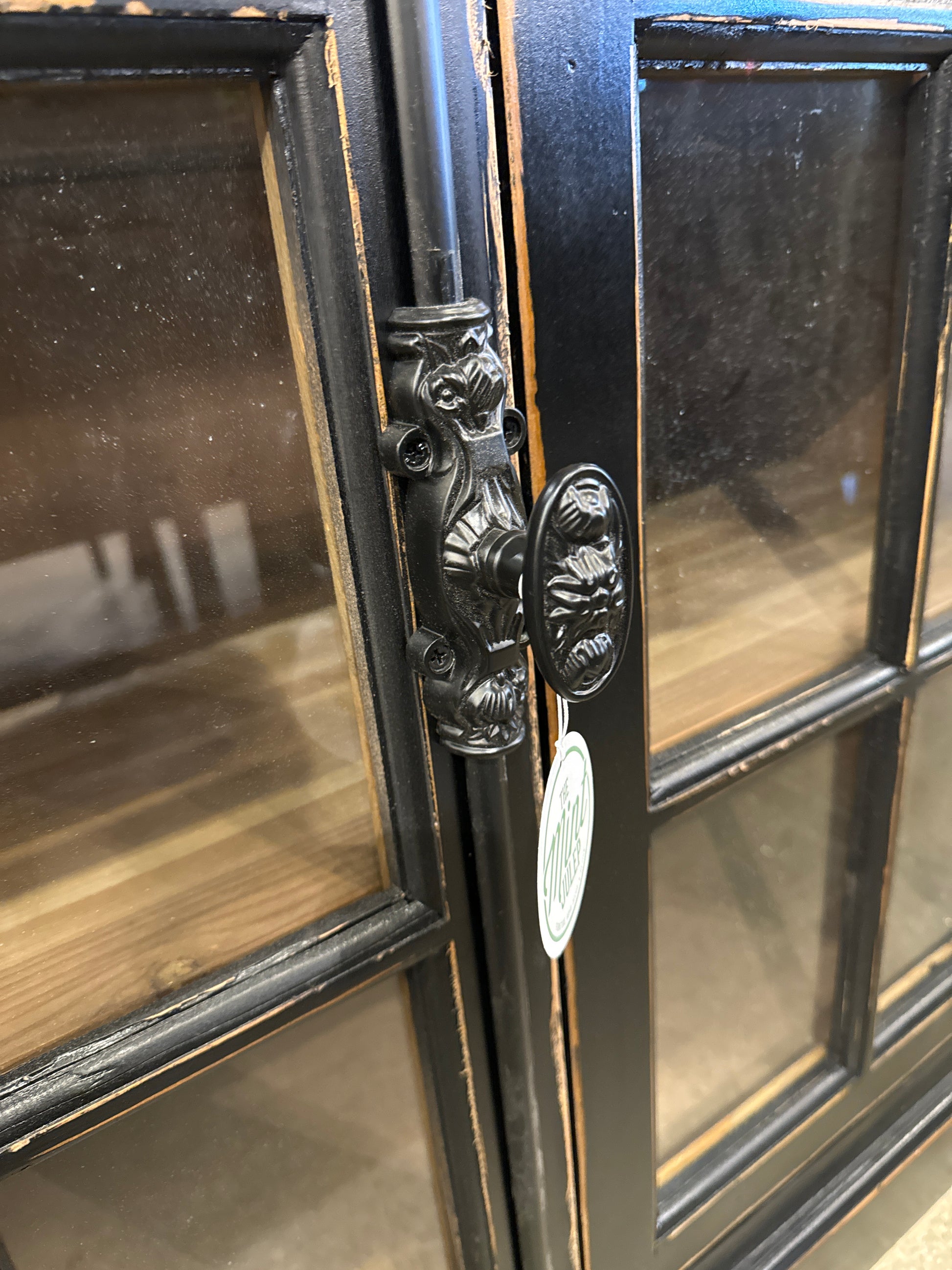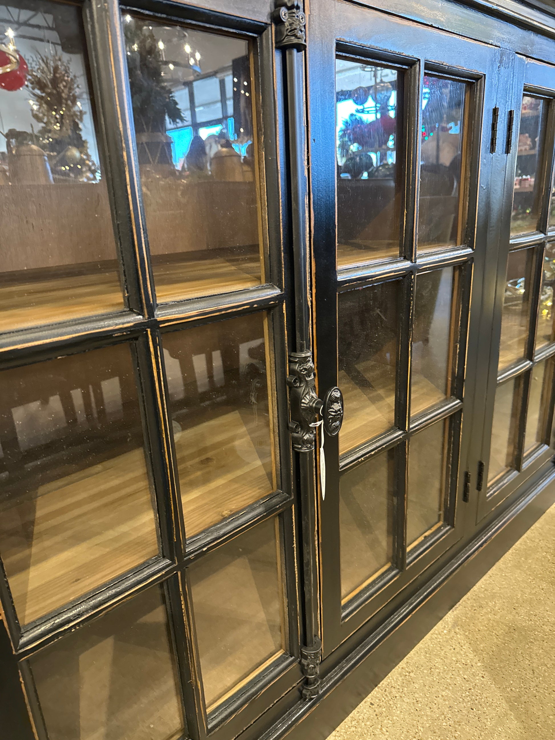 Elevate your space with the Alyssa Elm Window Pane Console in black. The modern black finish and Cremone bolt hardware add a sleek touch, while the display and storage options make it functional. Bring style and organization to any room with this console!