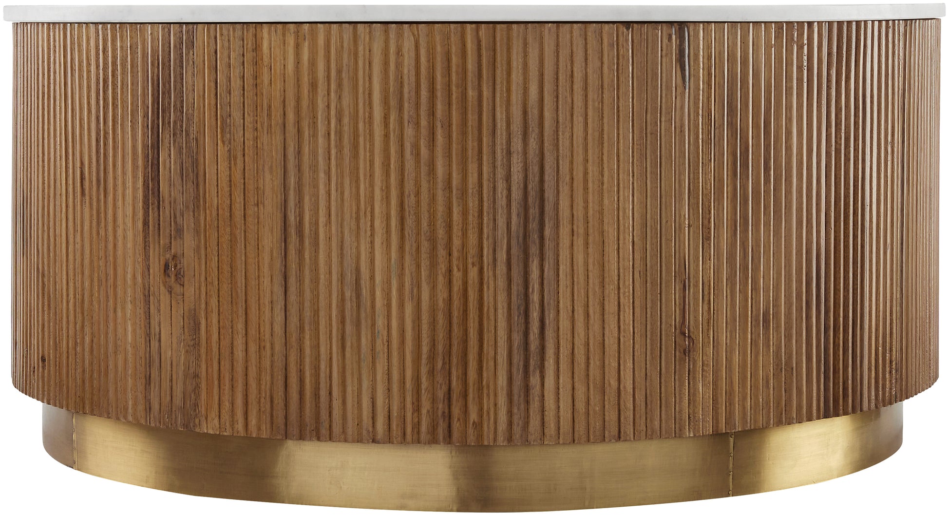 Introducing the Amelia Marble & Wood Coffee Table. Crafted with a sleek marble top and sturdy wood base, this modern piece is sure to elevate any living space. Enhanced with a luxurious gold base and unique ridges, this coffee table adds a touch of elegance and sophistication to your home.