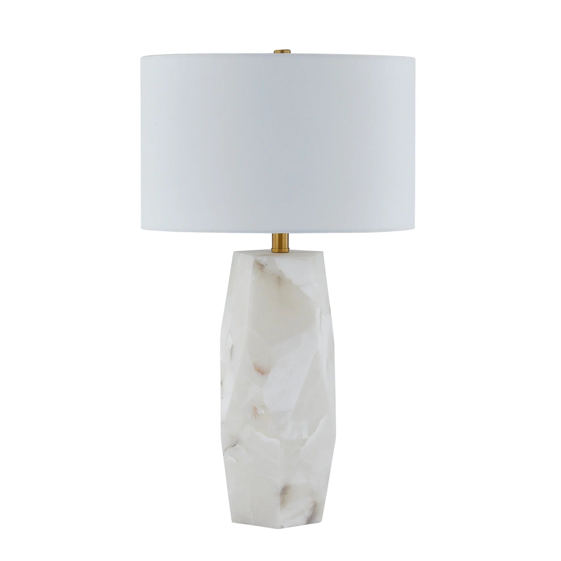 This lamp is a timeless piece with an abundance of elegance, seamlessly blending luxurious materials with a sculptural silhouette. Crafted from alabaster, its geometric form showcases the stone’s natural variations, adding depth and sophistication. Gold hardware complements the design with a warm, polished accent, while a crisp white drum shade provides a soft, balanced glow.