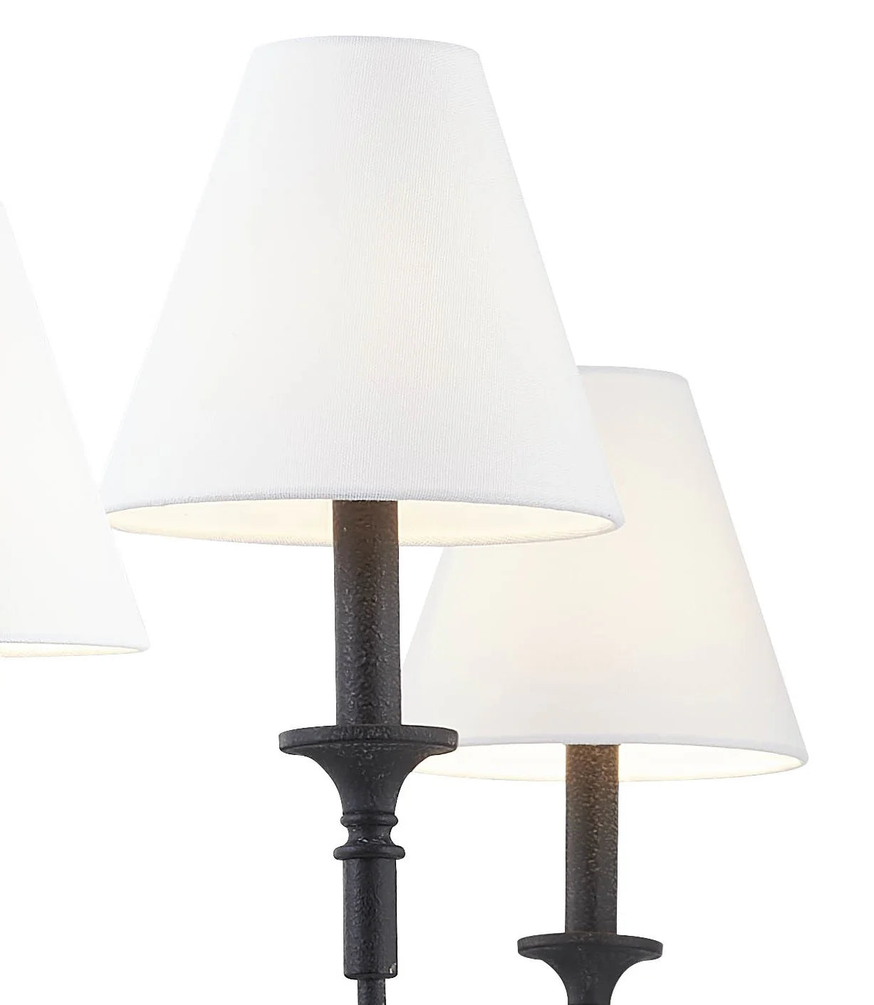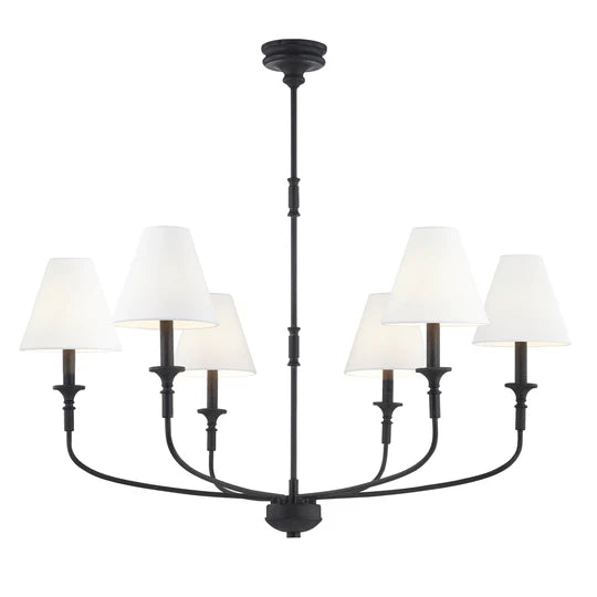 A chandelier with a traditional design with transitional elements. Its matte black finish brings a touch of contemporary to a traditional look, its 6 lights will bring a warm and welcoming glow to your home while its fabric shades highlight each one. It full black body finish with the subtle detailing on its stem and arms give it a modern take on its traditional design.