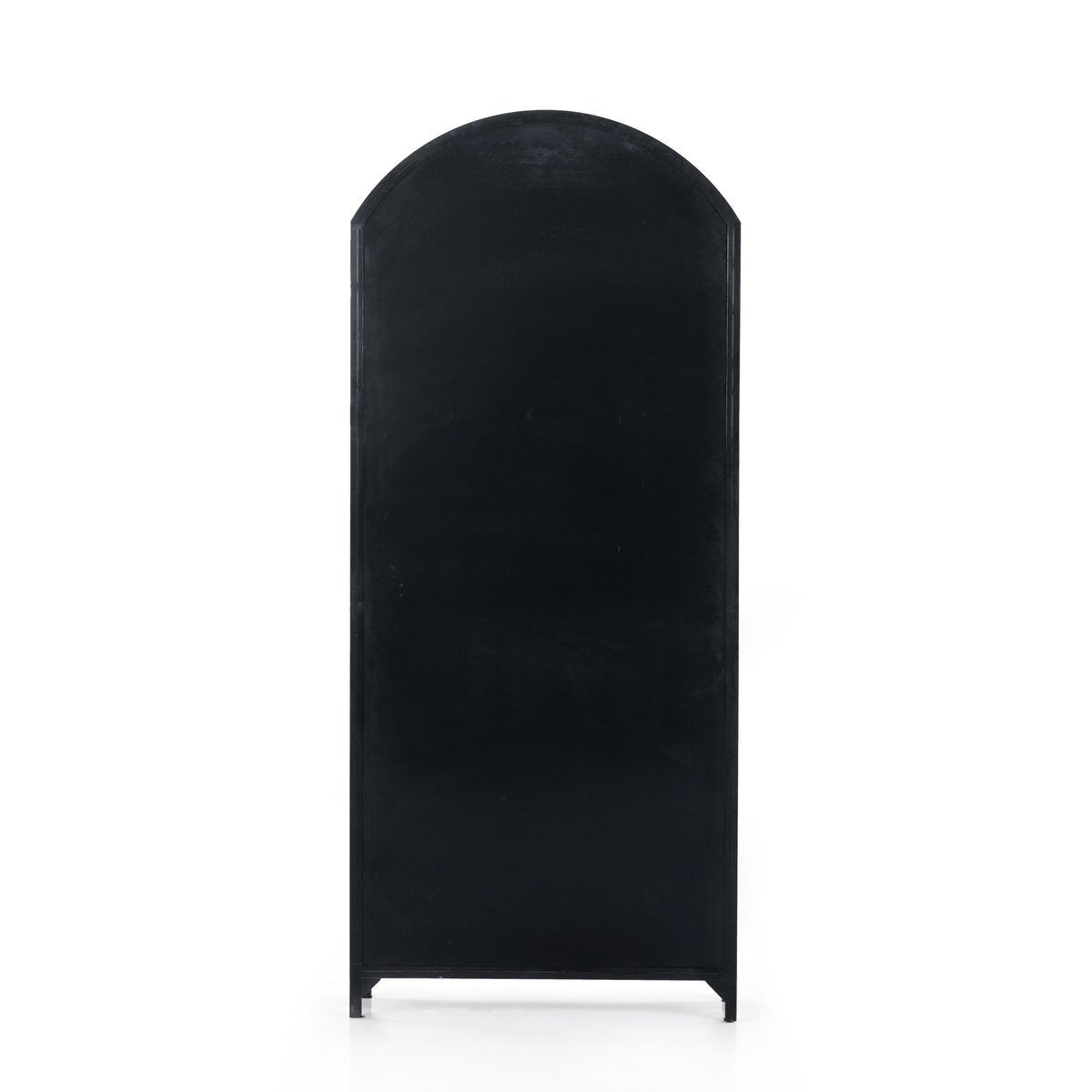 This hand-forged, arched, glass-paneled iron cabinet is perfect for displaying books, barware, and other treasures. With a matte black finish and complementing brass hardware, it adds sophistication and charm to any room. An excellent choice for showcasing your collection.