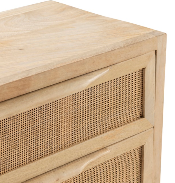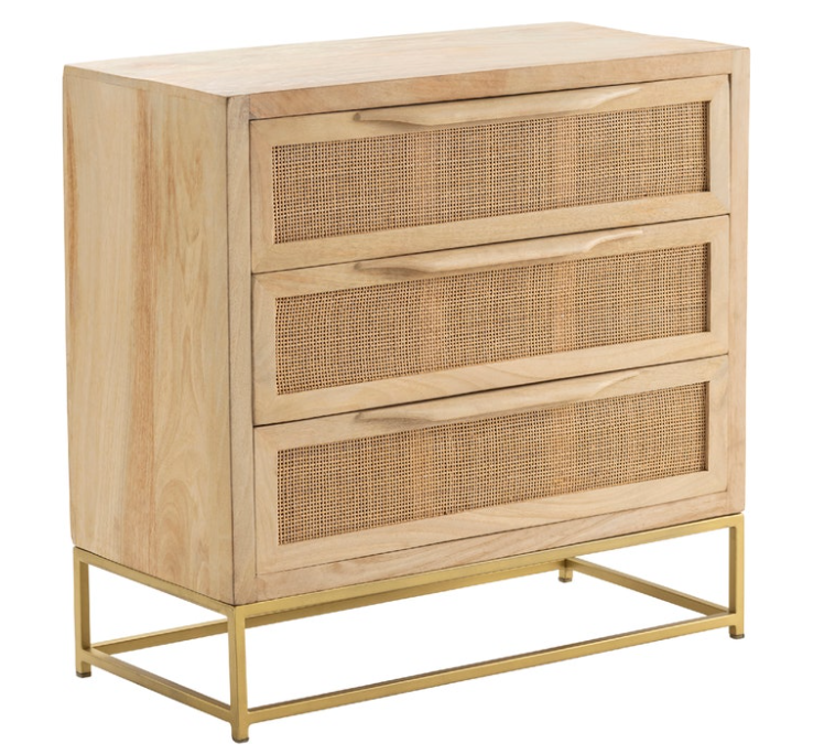 This Natural Cane Chest has three drawers that provide ample hidden storage space. Each drawer features a cane front. A gold, metal base holds up the light-brown wooden construction of the chest. This coastal, transitional piece makes the perfect accent piece for your living room or hallway.