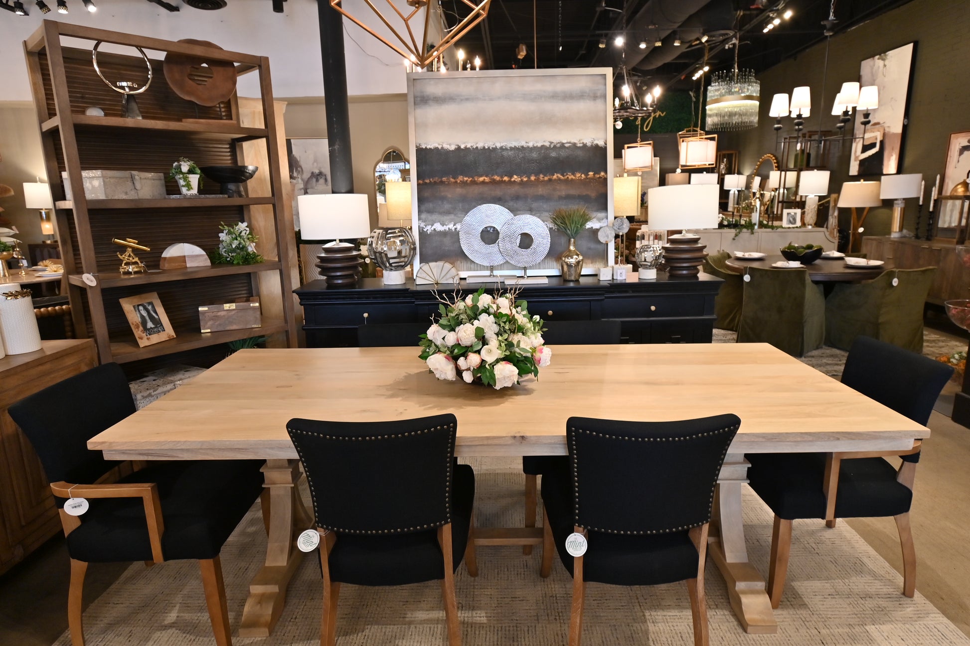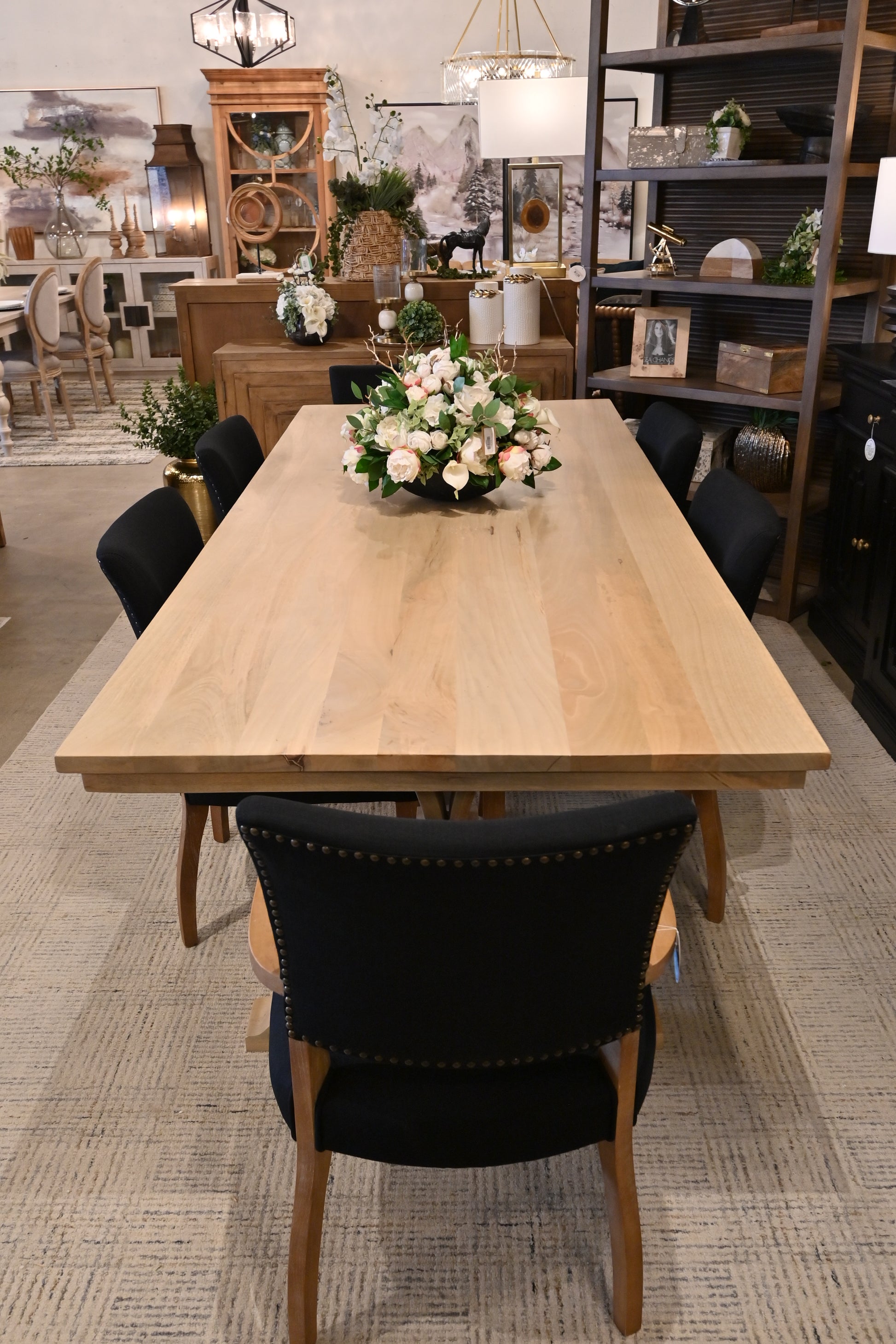 This 8-foot dining table is crafted from solid mango wood and finished in a light natural tone. The trestle base provides a sturdy support, making it a perfect addition to any dining space. Enjoy the durability and timeless style of this Callen Solid Mango Wood Dining Table.