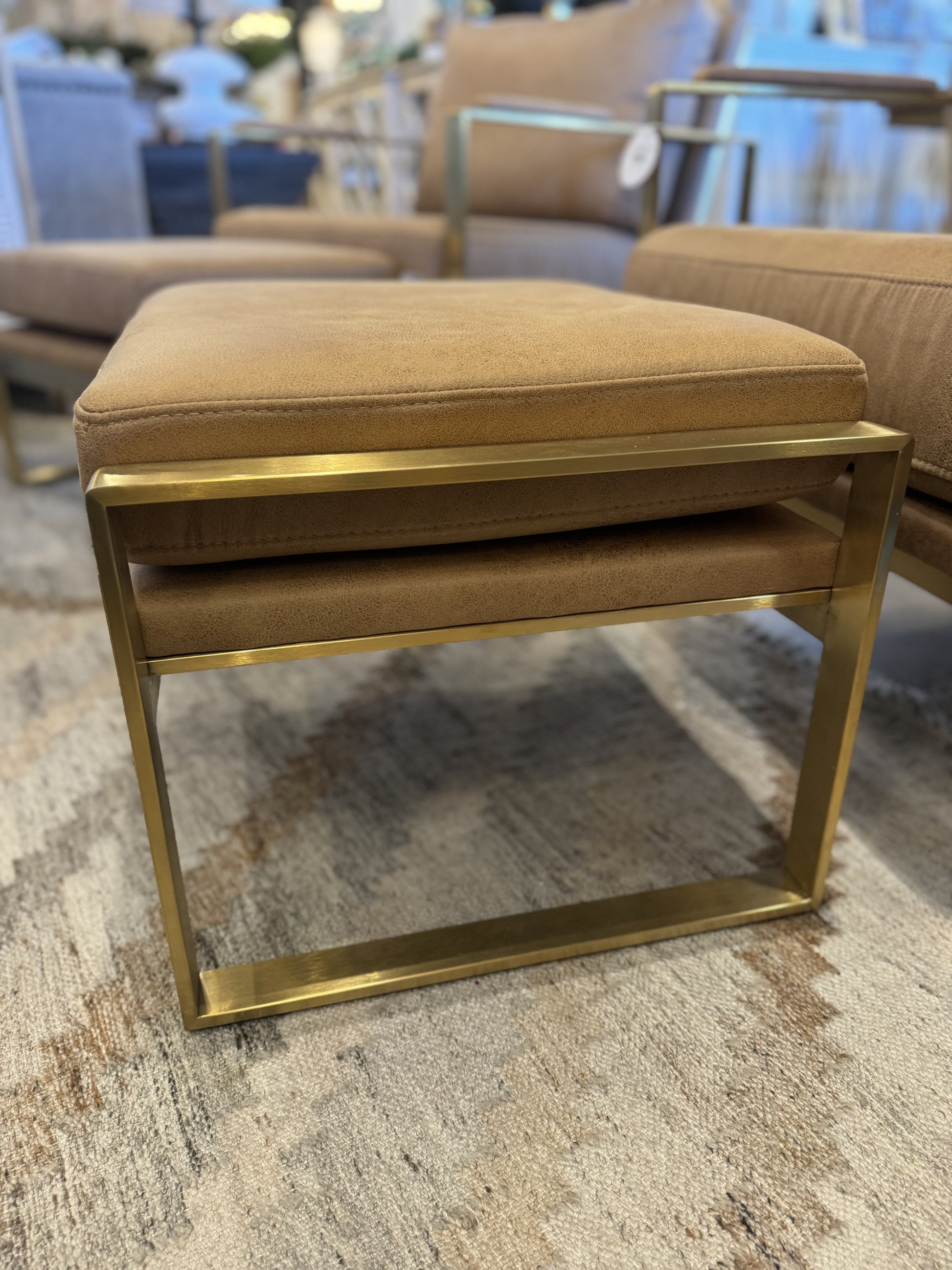 Introducing the Calvin Club Chair Ottoman in luxurious camel suede with elegant gold metal legs that match the Calvin Club Chairs!