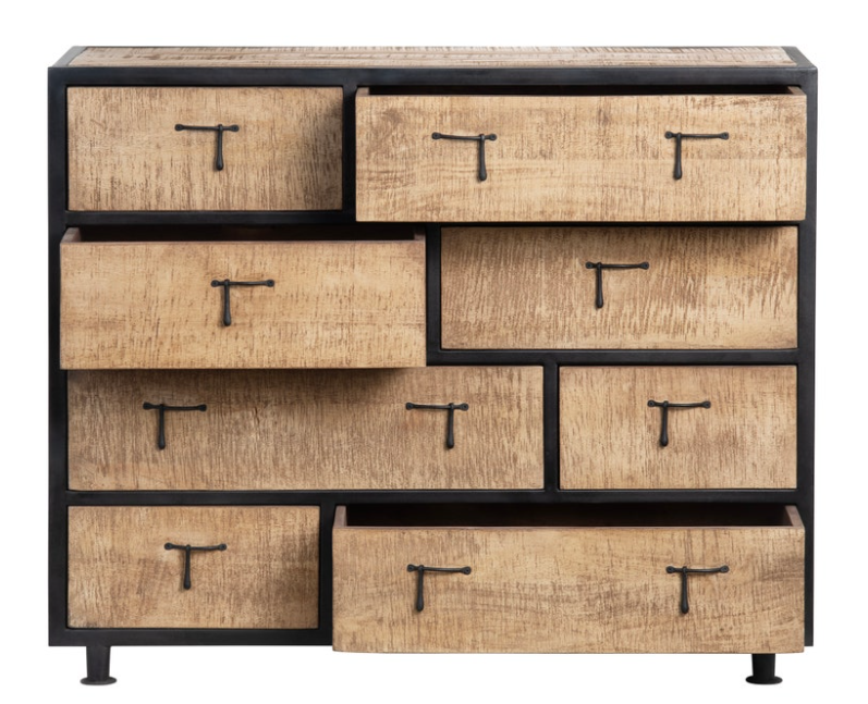 The Campbell Chest features 8 mango wood drawers with a black metal frame.