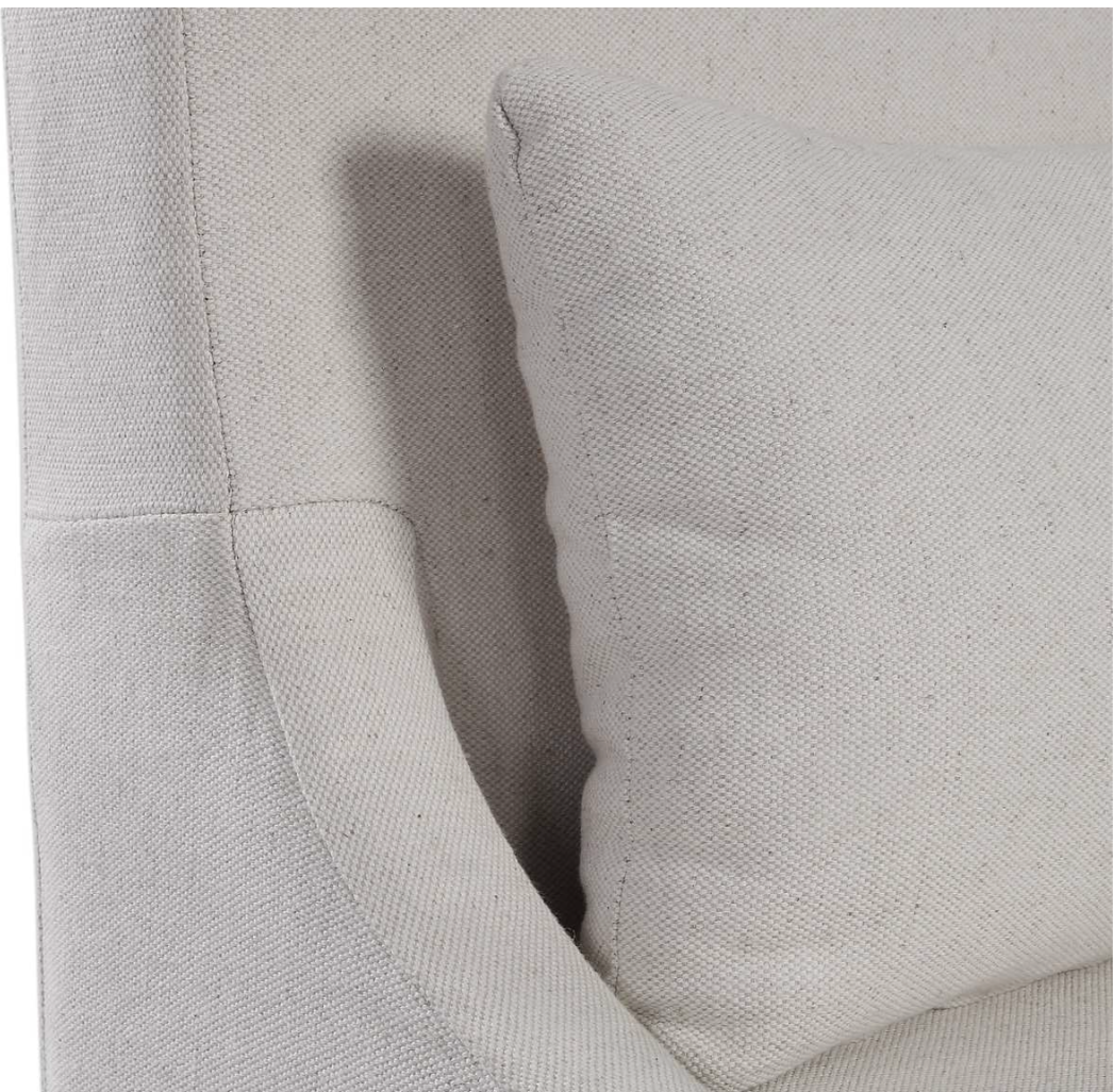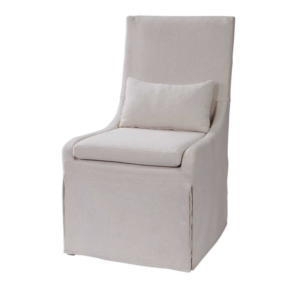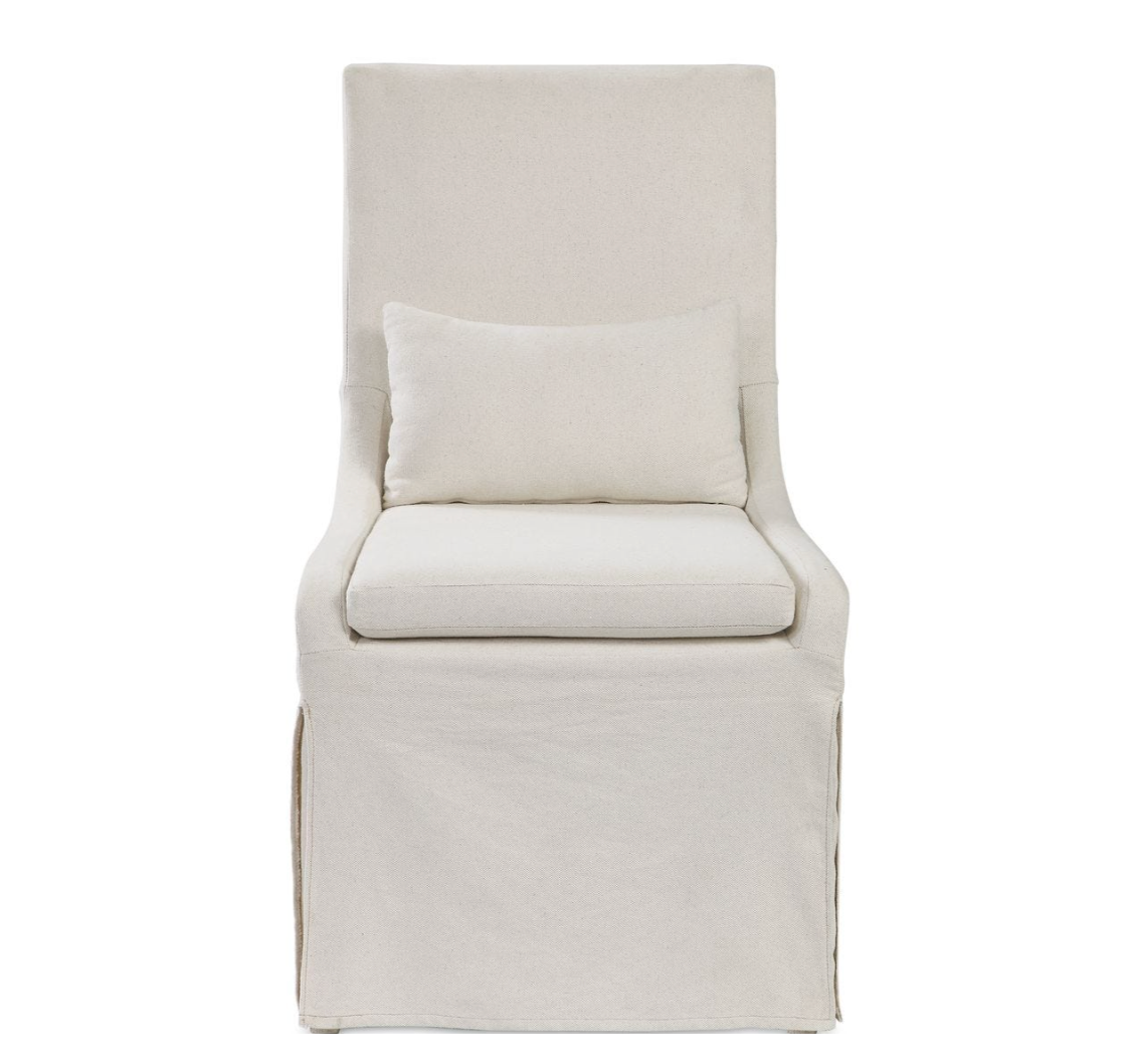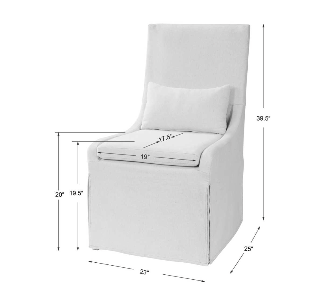Simplistic in form, this casually sophisticated armless chair features a tailored off-white linen blend slipcover with a plush cushion seat and kidney pillow for added comfort, with added performance treatment to resist soiling and stains.