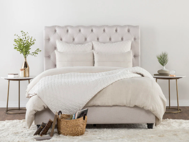 The Doheney Queen Bed is a sleek and stylish sleigh bed with a hand-finished oatmeal colored fabric upholstery with decorative nail heads and button tufting. Constructed to be both durable and comfortable, this bed is a versatile addition to any bedroom.