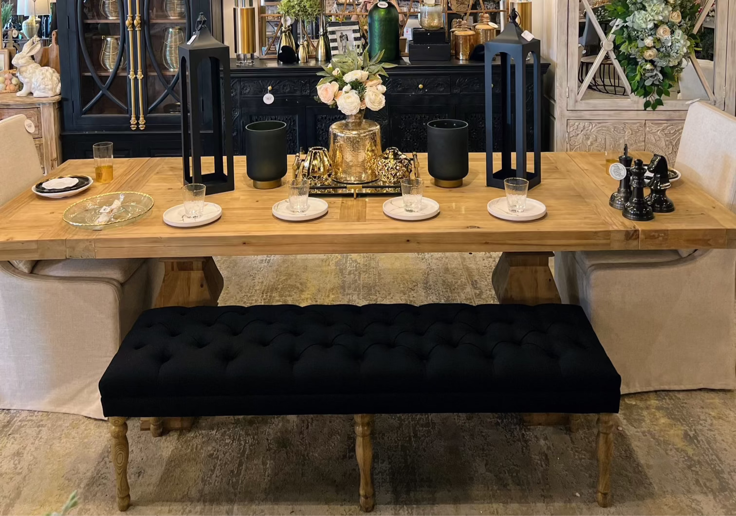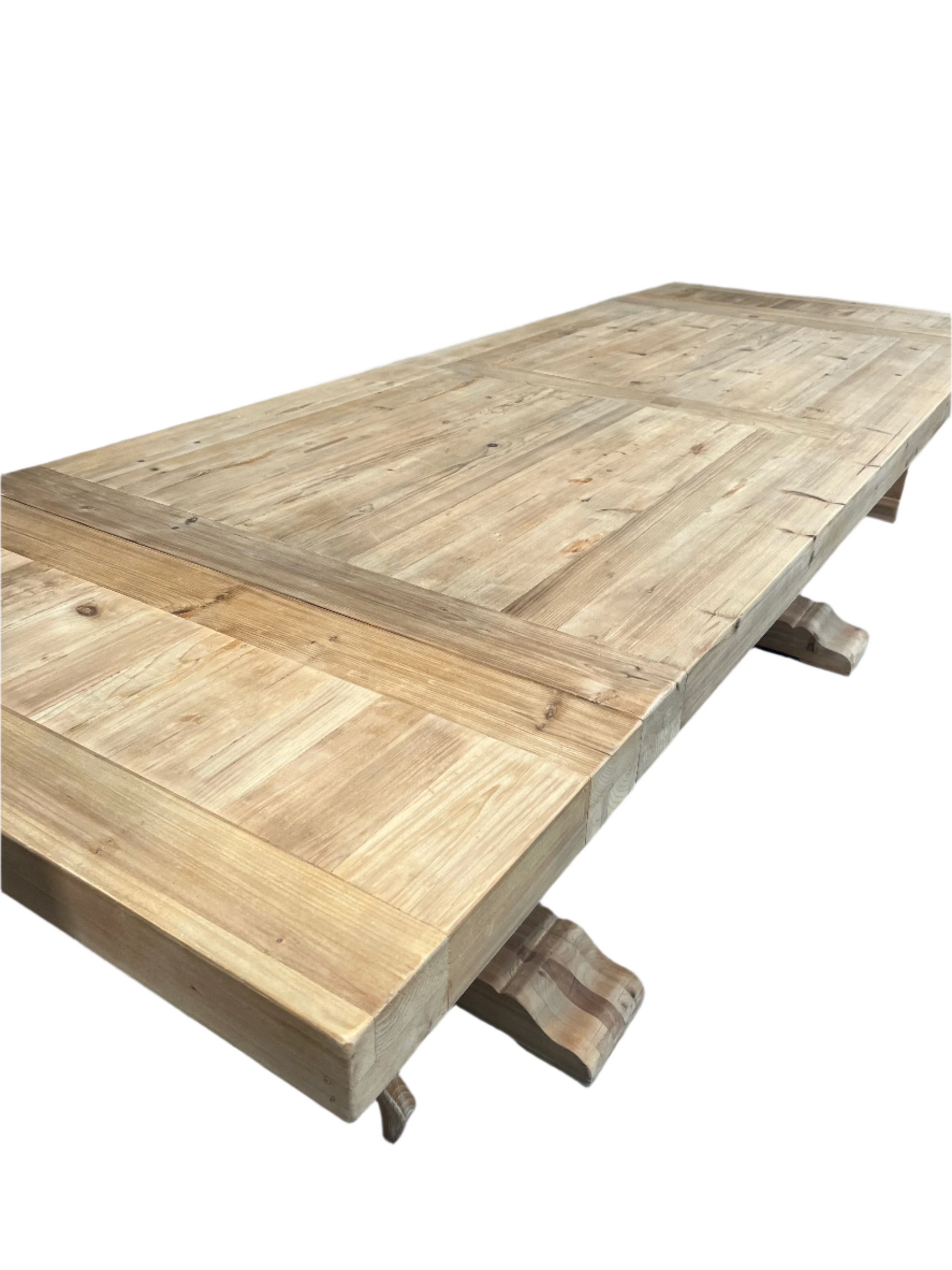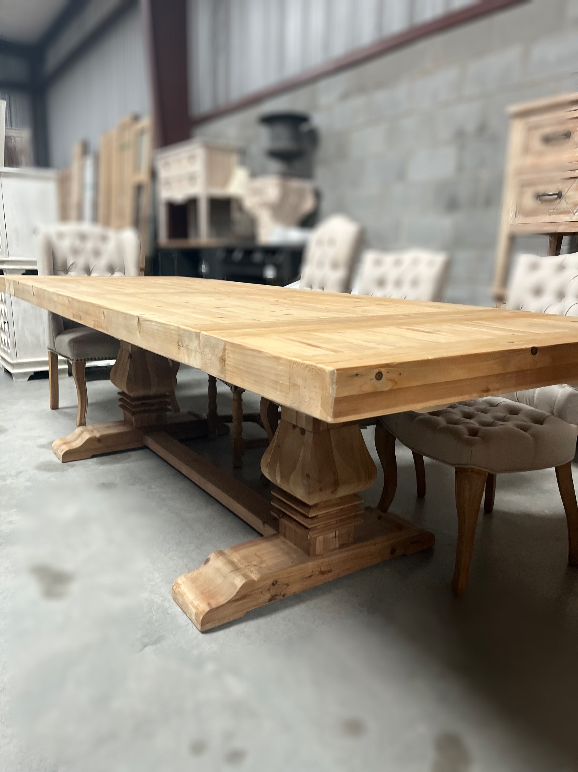 A generously sized extension dining table hand carved out of solid elm wood in a natural finish! Our gorgeous trestle base dining table will be the feature piece of your grand dining space. Easily seats 8+!