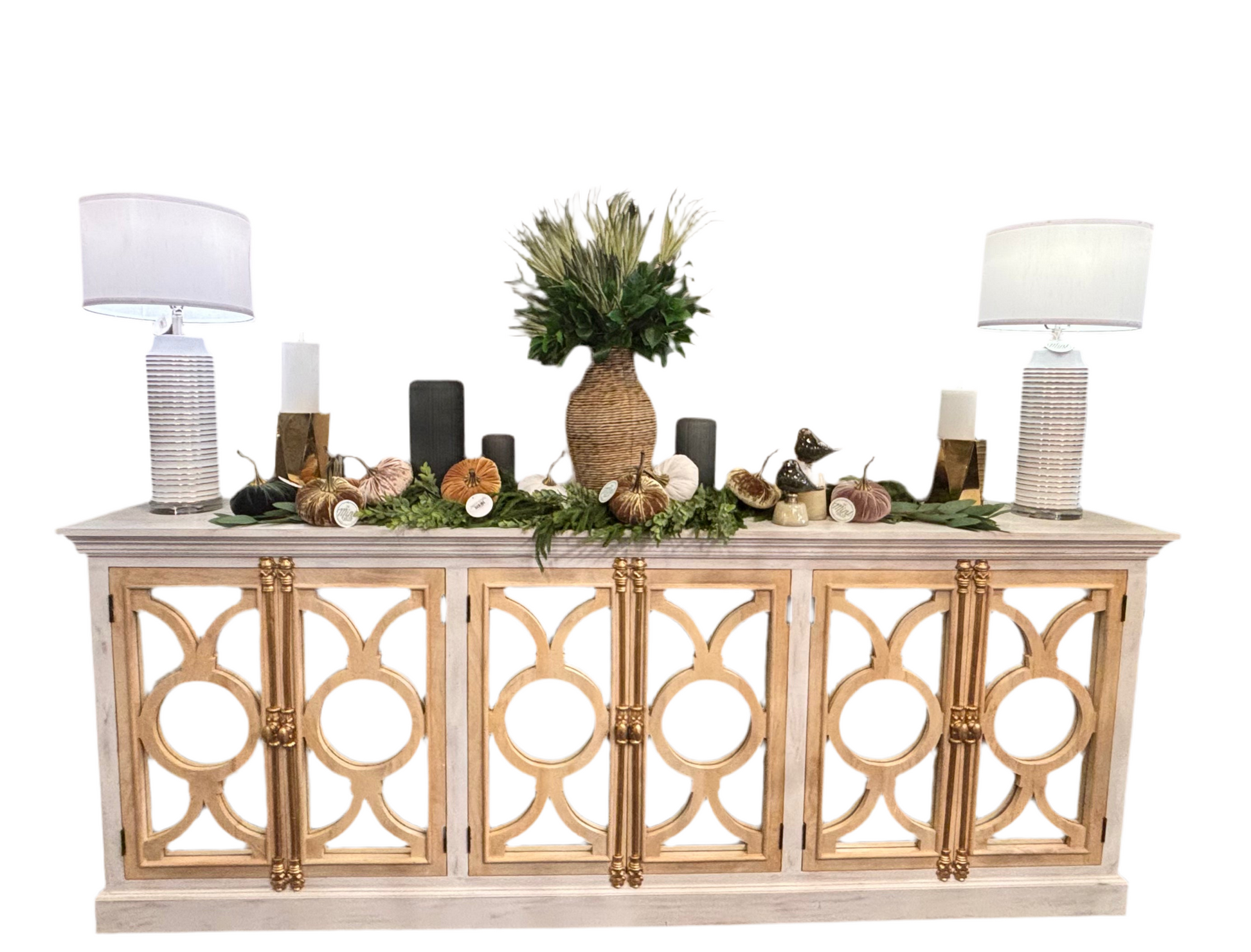 Our extra-long white, mirrored doors, mango wood breakfront features antiqued white finish with fabulous, oversized gold cremone bolt hardware!! You'll love the fretwork and glass doors and stunning hardware. Perfect for your dining room buffet or your TV console--or an accent piece anywhere. Plenty of storage and style here!