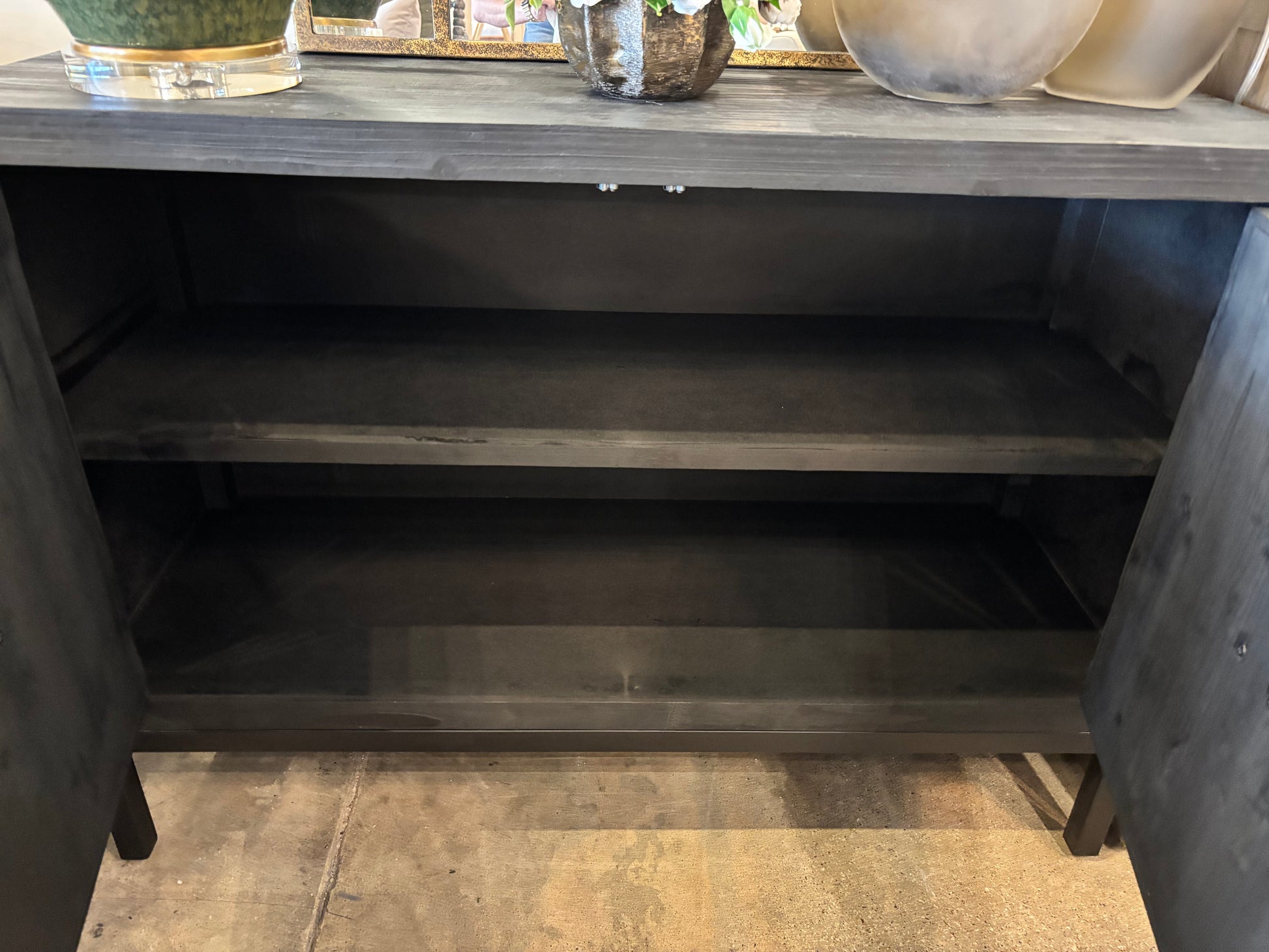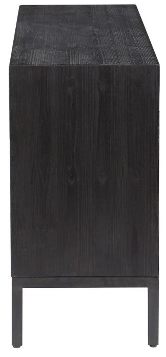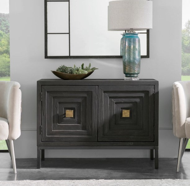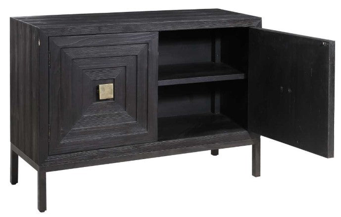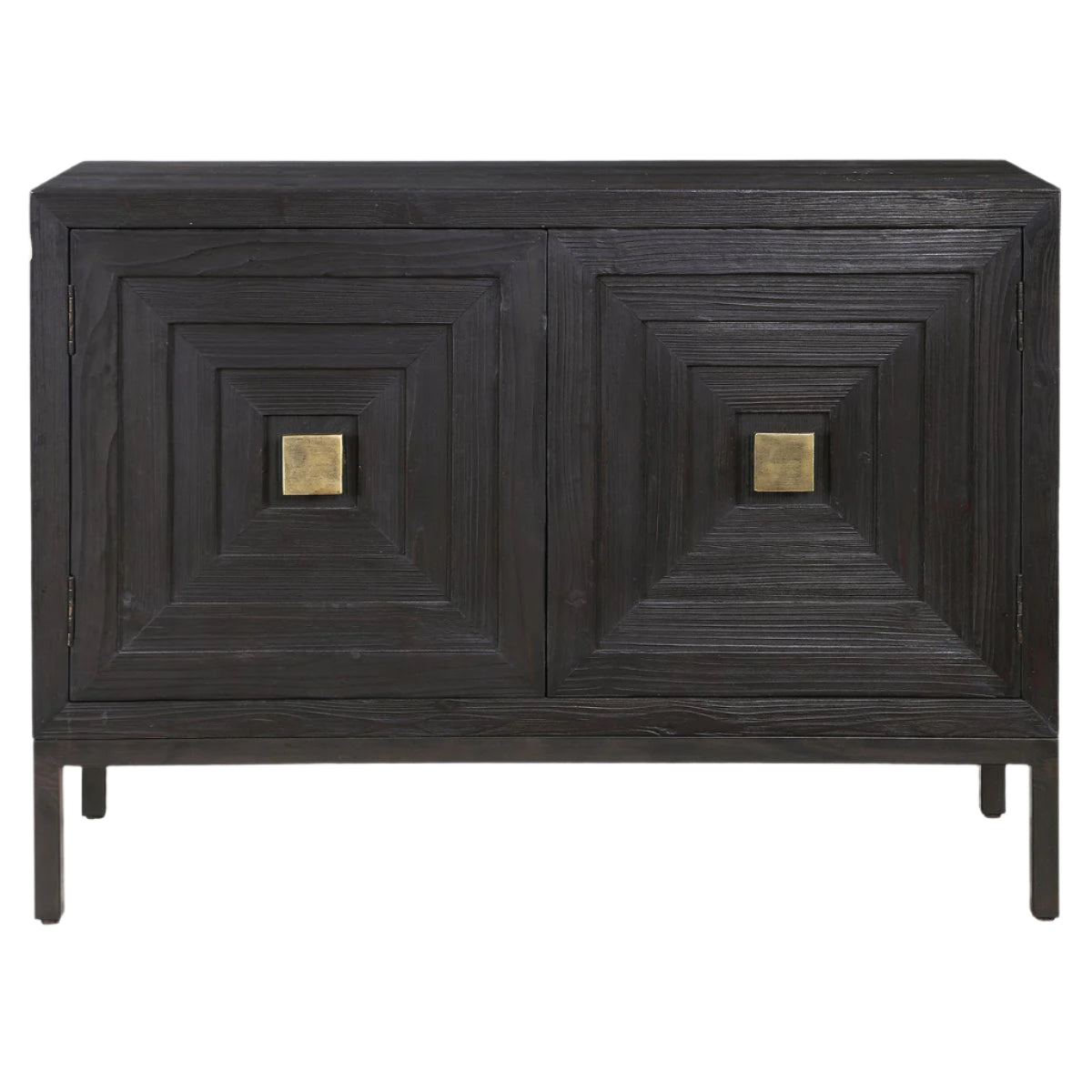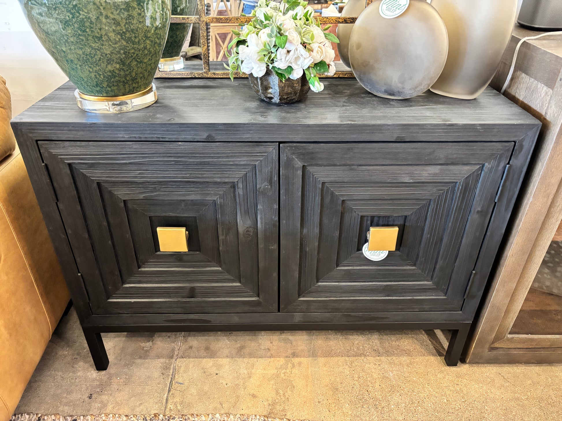 Introducing the Aiken 2 Door Cabinet - a sleek and stylish addition to any space. With a modern geometric design in black and gold, this wooden cabinet is both functional and eye-catching. Elevate your home decor with this must-have statement piece!