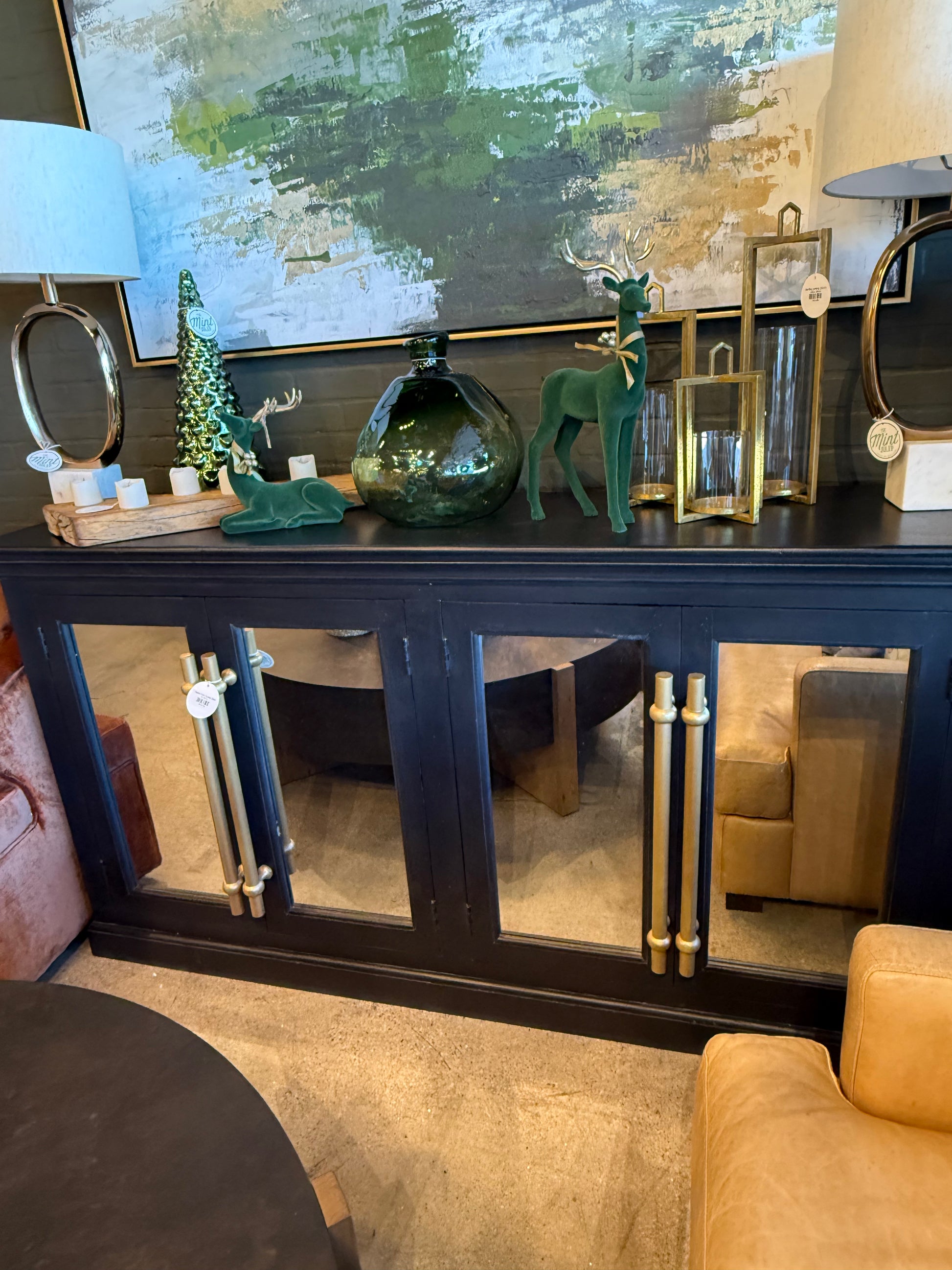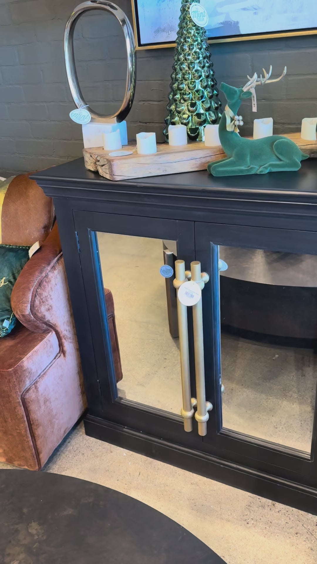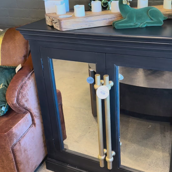 This stunning console table adds a touch of modern sophistication to any space. Crafted from solid mango wood with a black finish, this console is highlighted by its beautiful herringbone pattern and gold hardware, creating a luxurious centerpiece for any room.