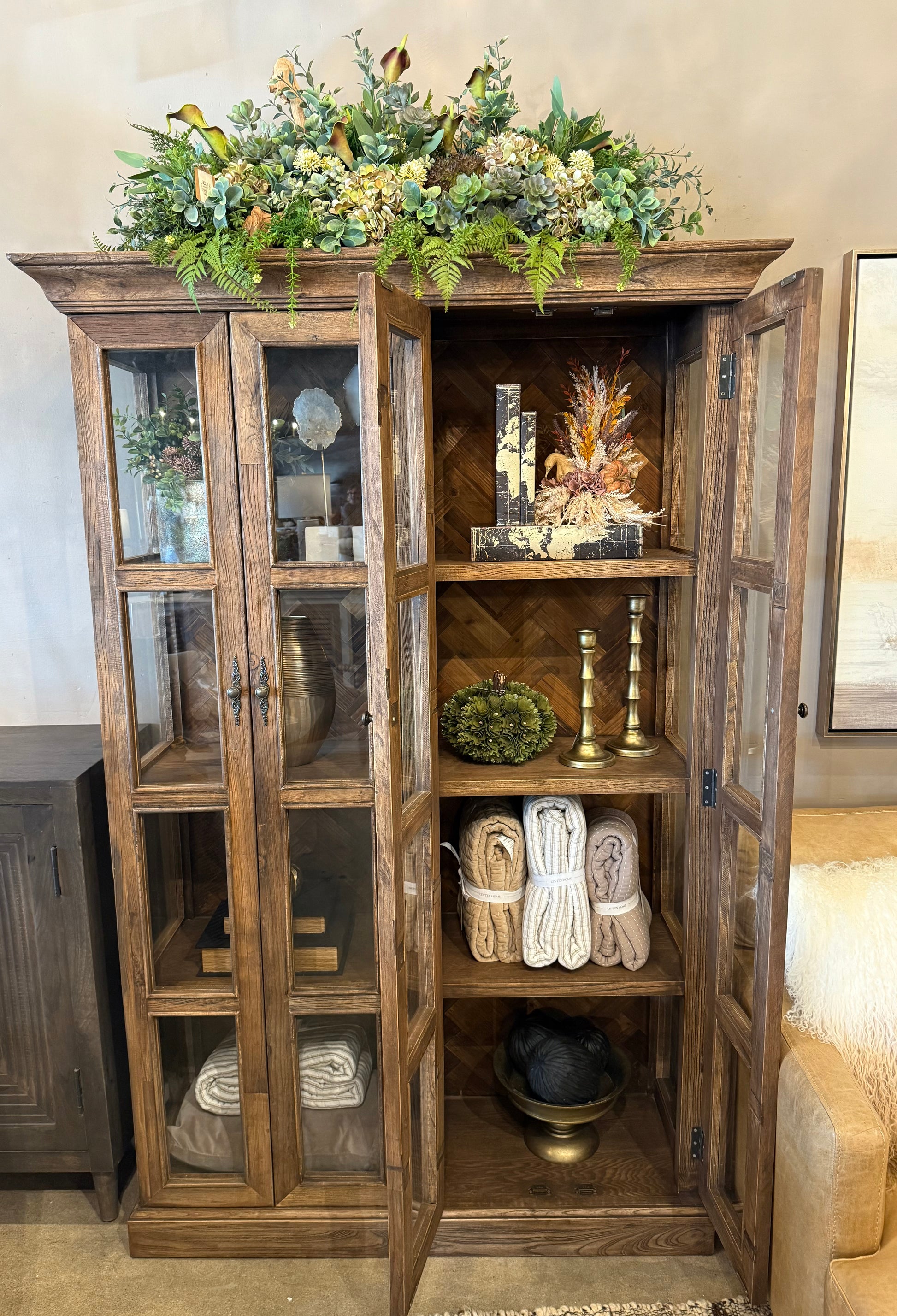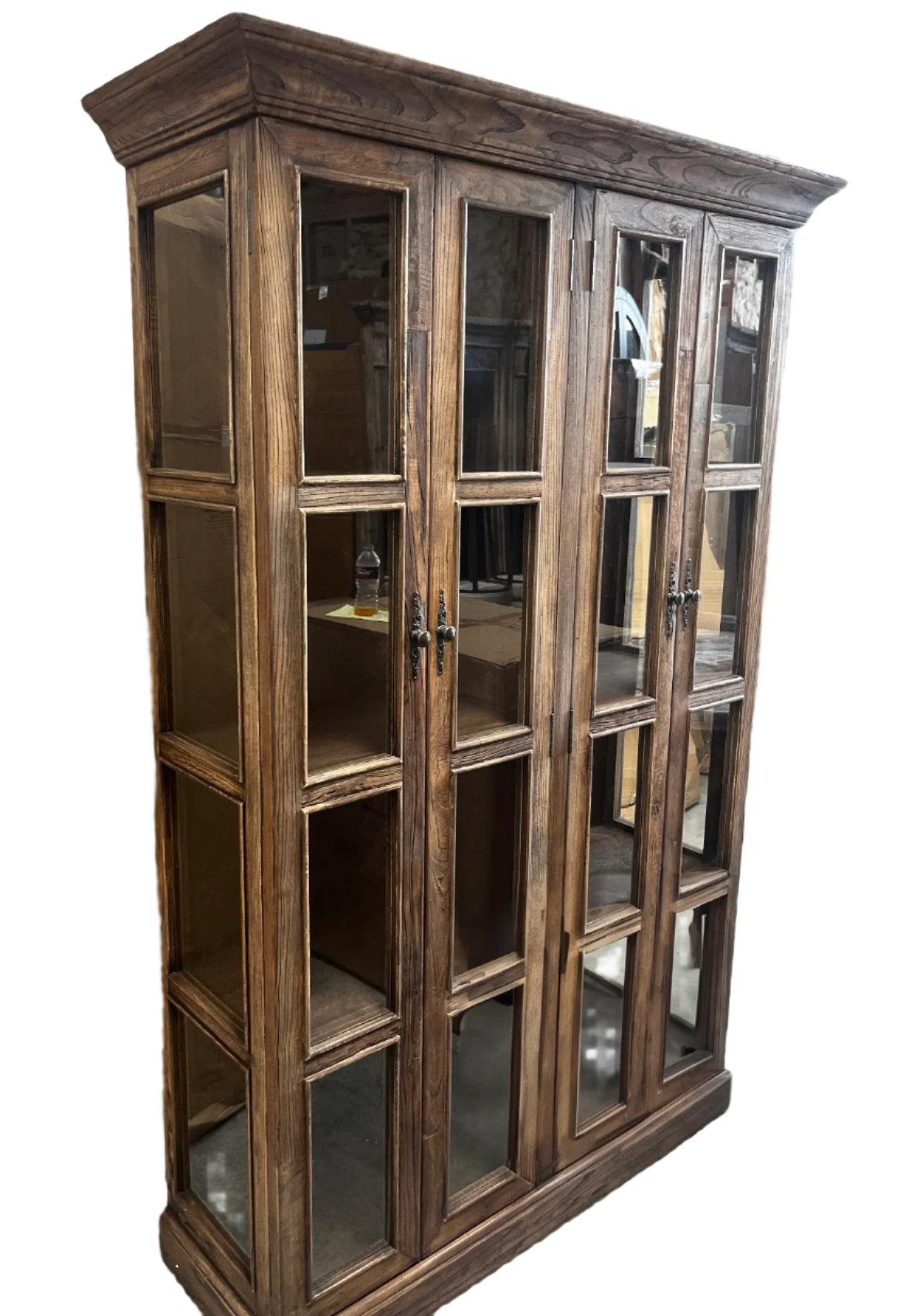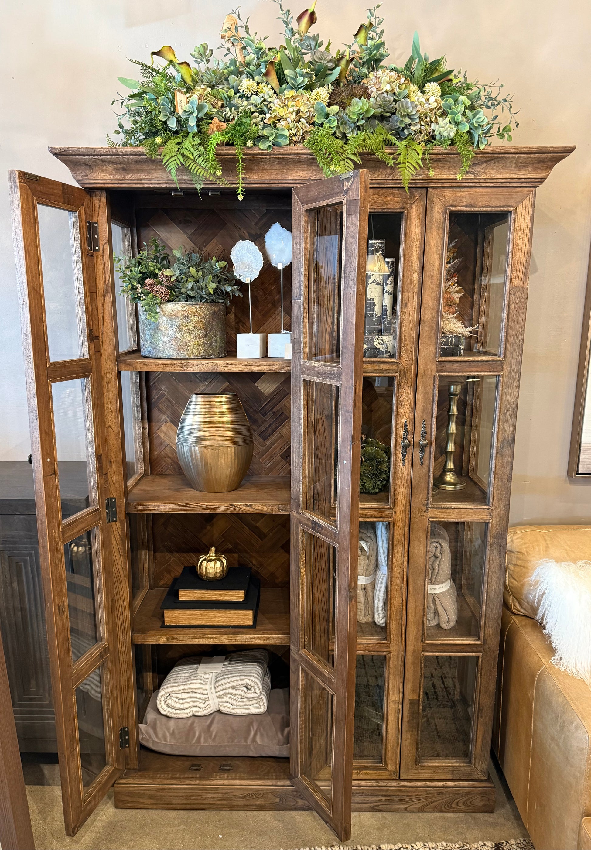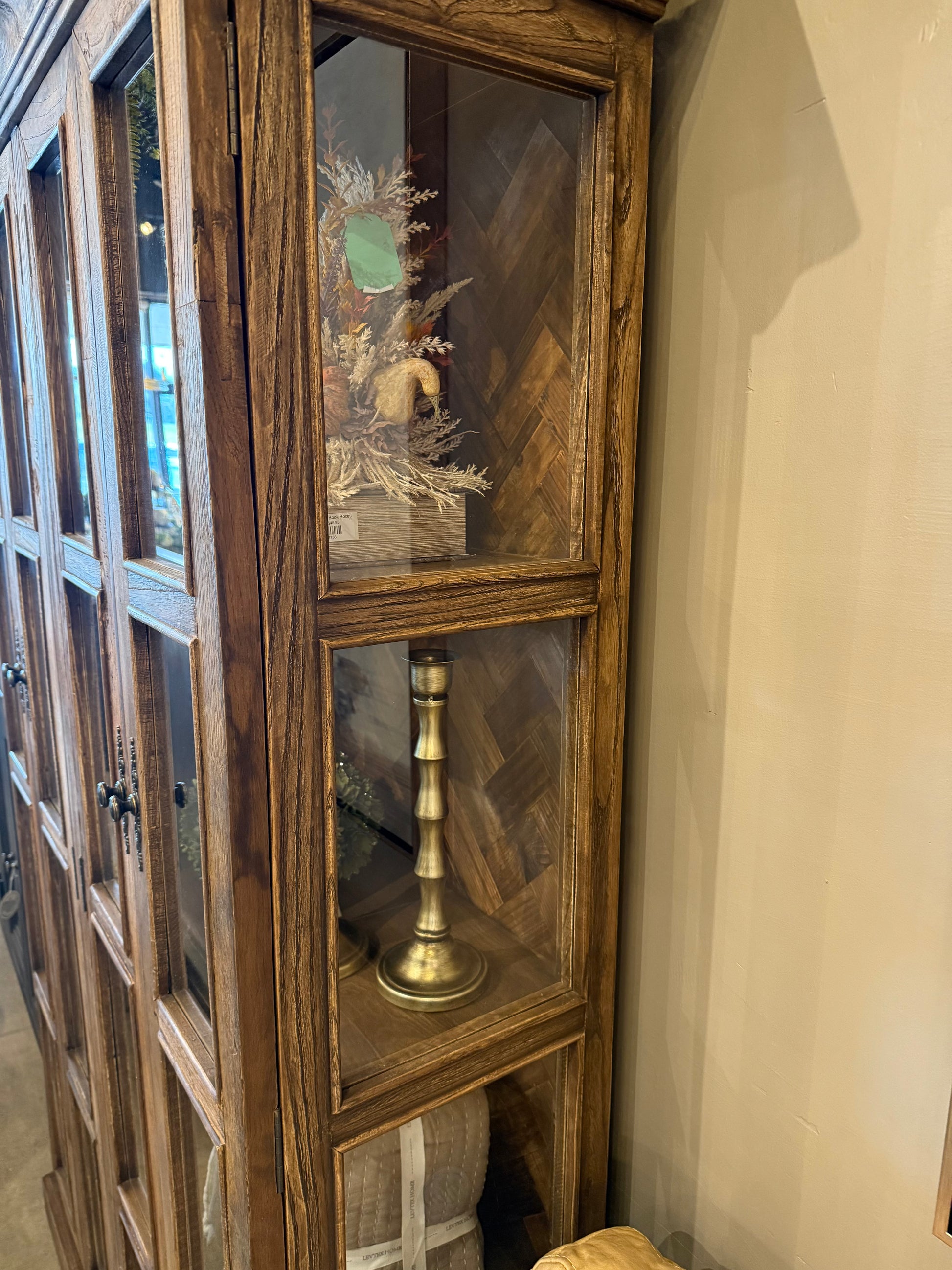 Beautifully tall natural, oak wood finish cabinet!! This unique piece of furniture offers ample display and storage space for books or decorative accessories or both. A wonderful and versatile piece that bridges styles.