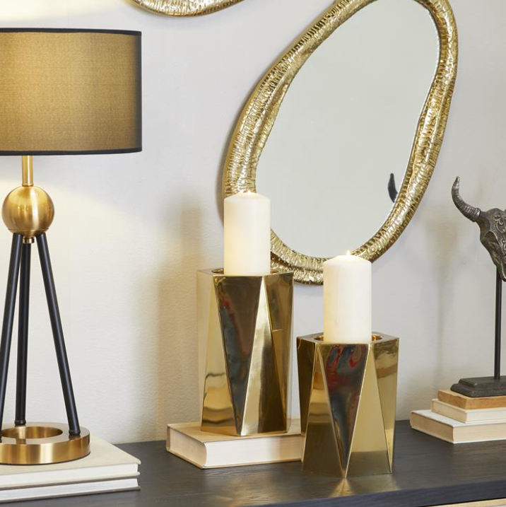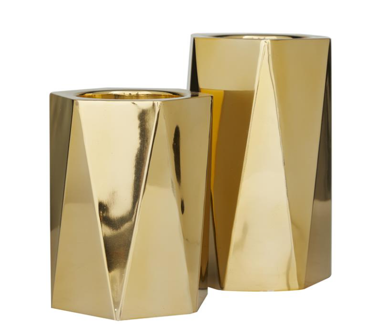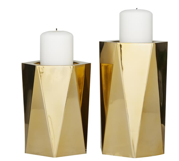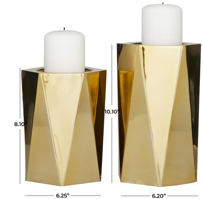 Pillar candle holders highlighting a shiny gold finish that provides a glamorous flair with a geometric faceted pattern adorns each of these 2 candle holders with embedded plates to avoid candle drippings.