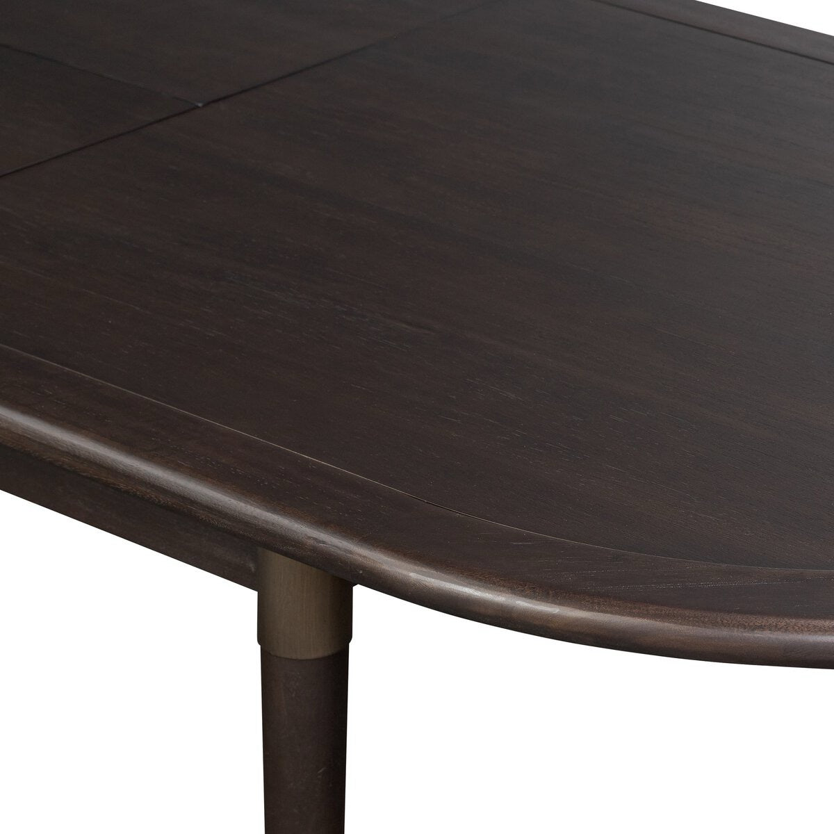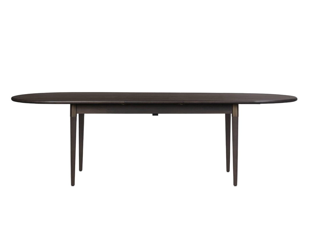 A study in simple detailing. Tapered legs pull through the pill-shaped top of this smoked oak dining table, with the rich knots, cracking and grain adding character! This gorgeous dining table will last for generations to come!
