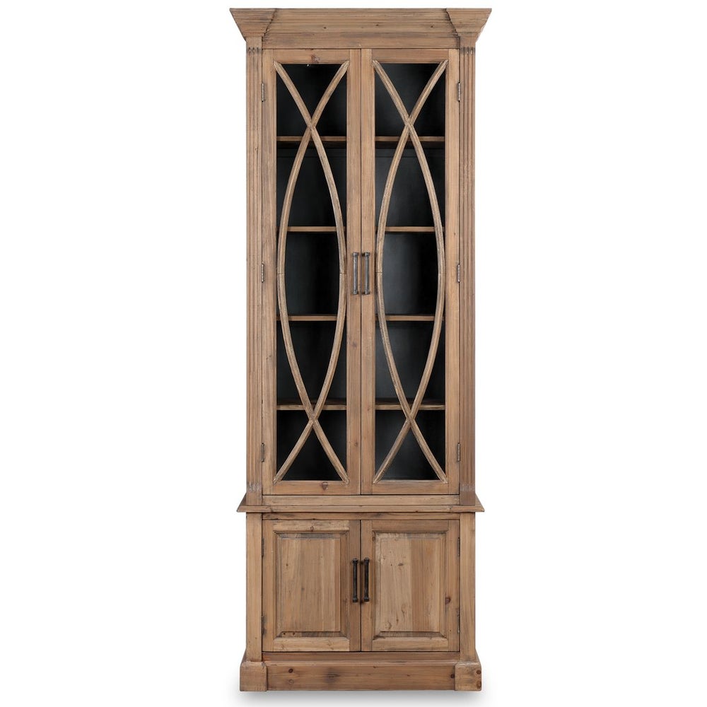 Handcrafted from recycled fir wood in a weathered oak stain, with dramatic decorative glass door fronts and carved moldings, with bottom featuring an open storage area. Iron bar pulls are an old industrial finish. Solid wood will continue to move with temperature and humidity changes, which can result in small cracks and uneven surfaces, adding to its authenticity and character.