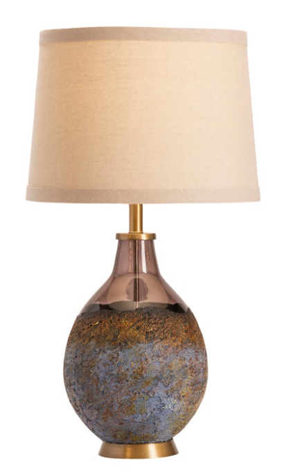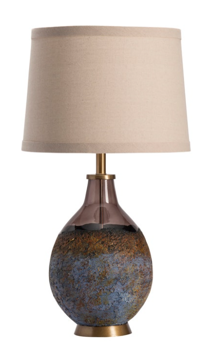 The Kai Table Lamp features a blown glass bottle in a rich cognac color that is layered with a molten earth textured finish. It is complimented by antique gold components, topped with a natural linen shade and a sculptural finial.
