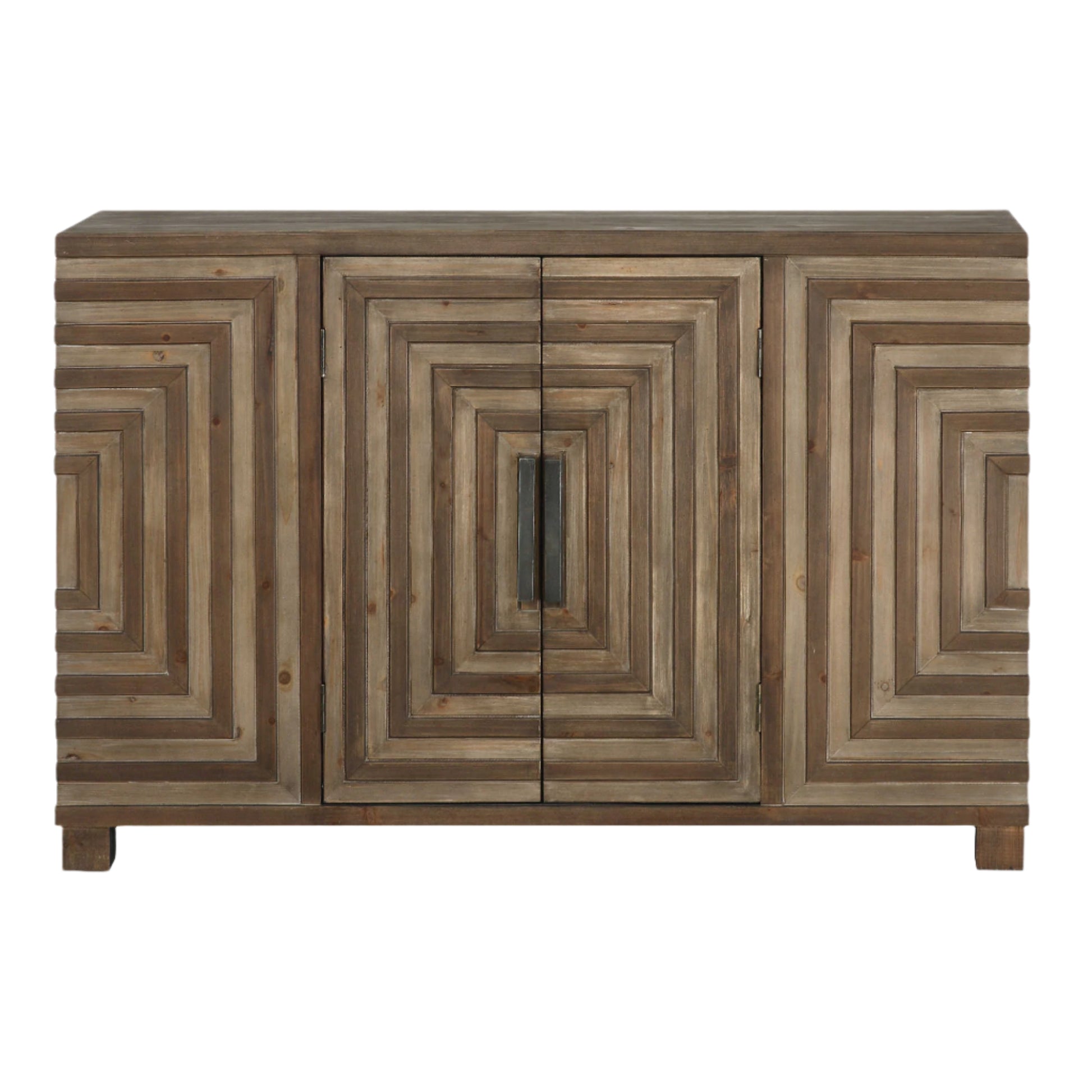 Geometric parquetry style console, with rustic two-toned fir veneer and old iron bar pulls. Center portion opens to two fixed interior shelves.