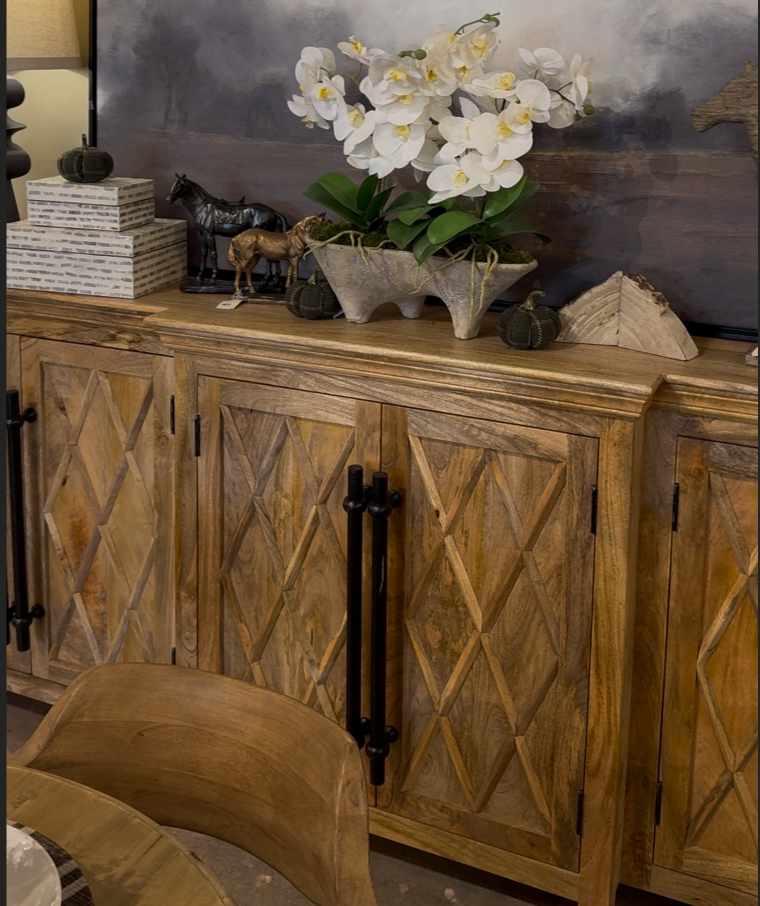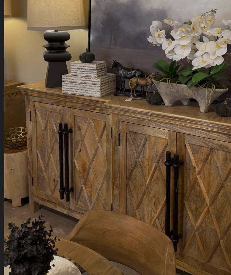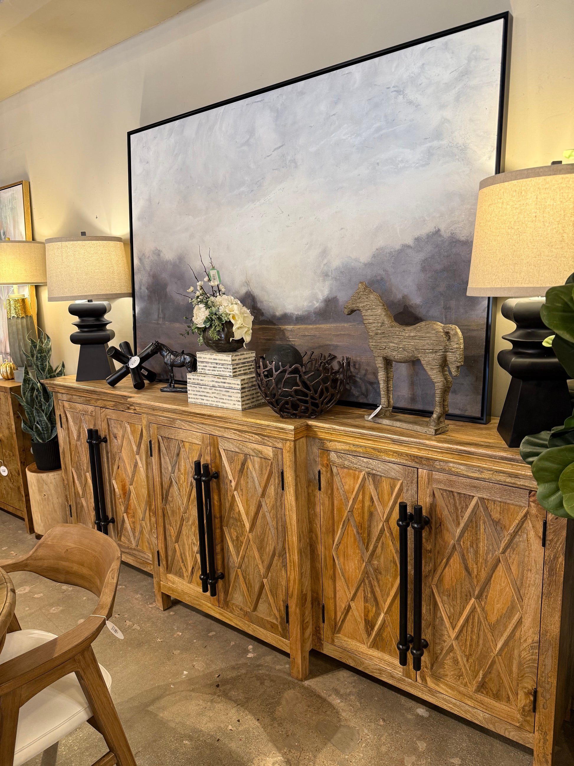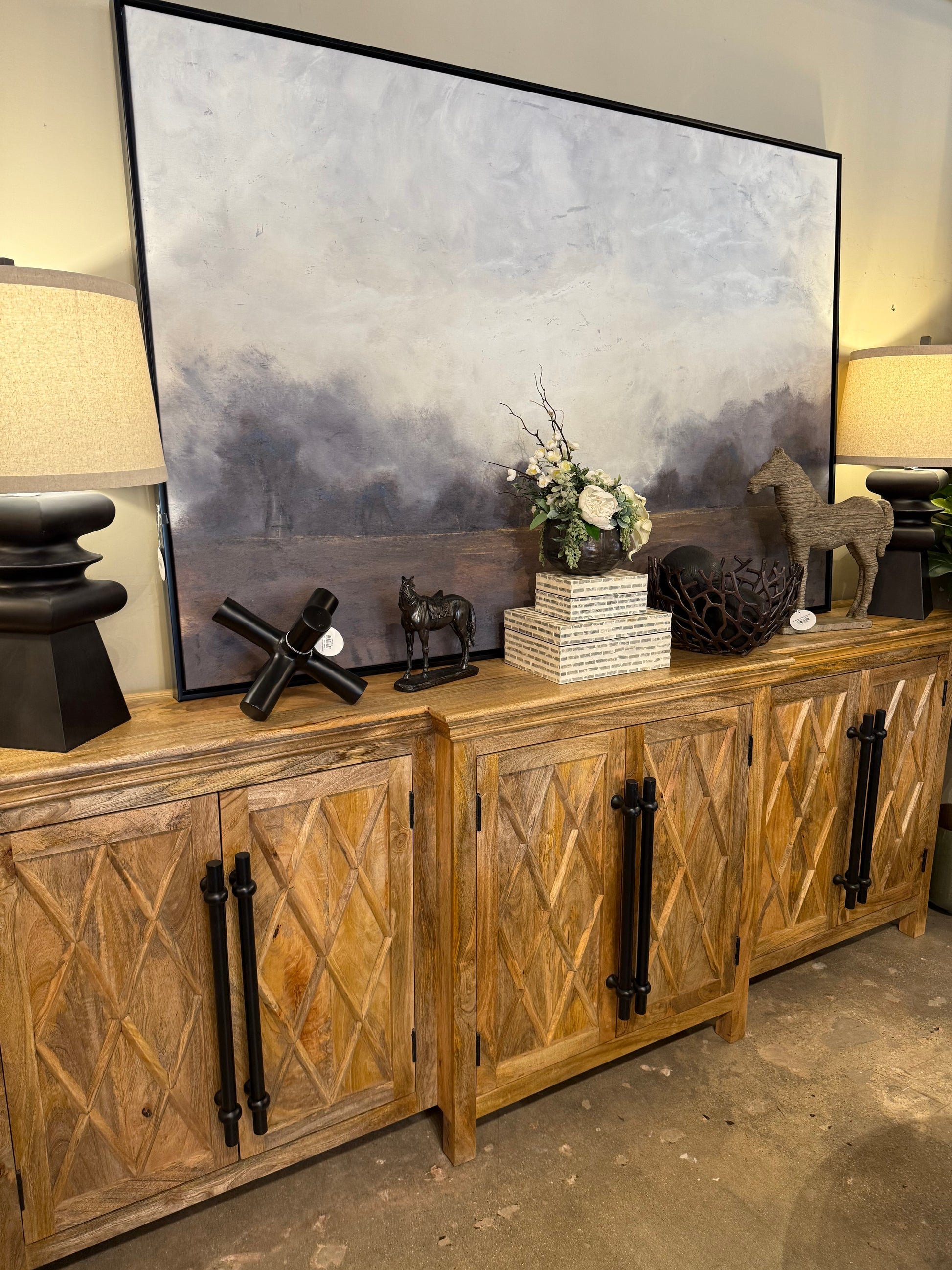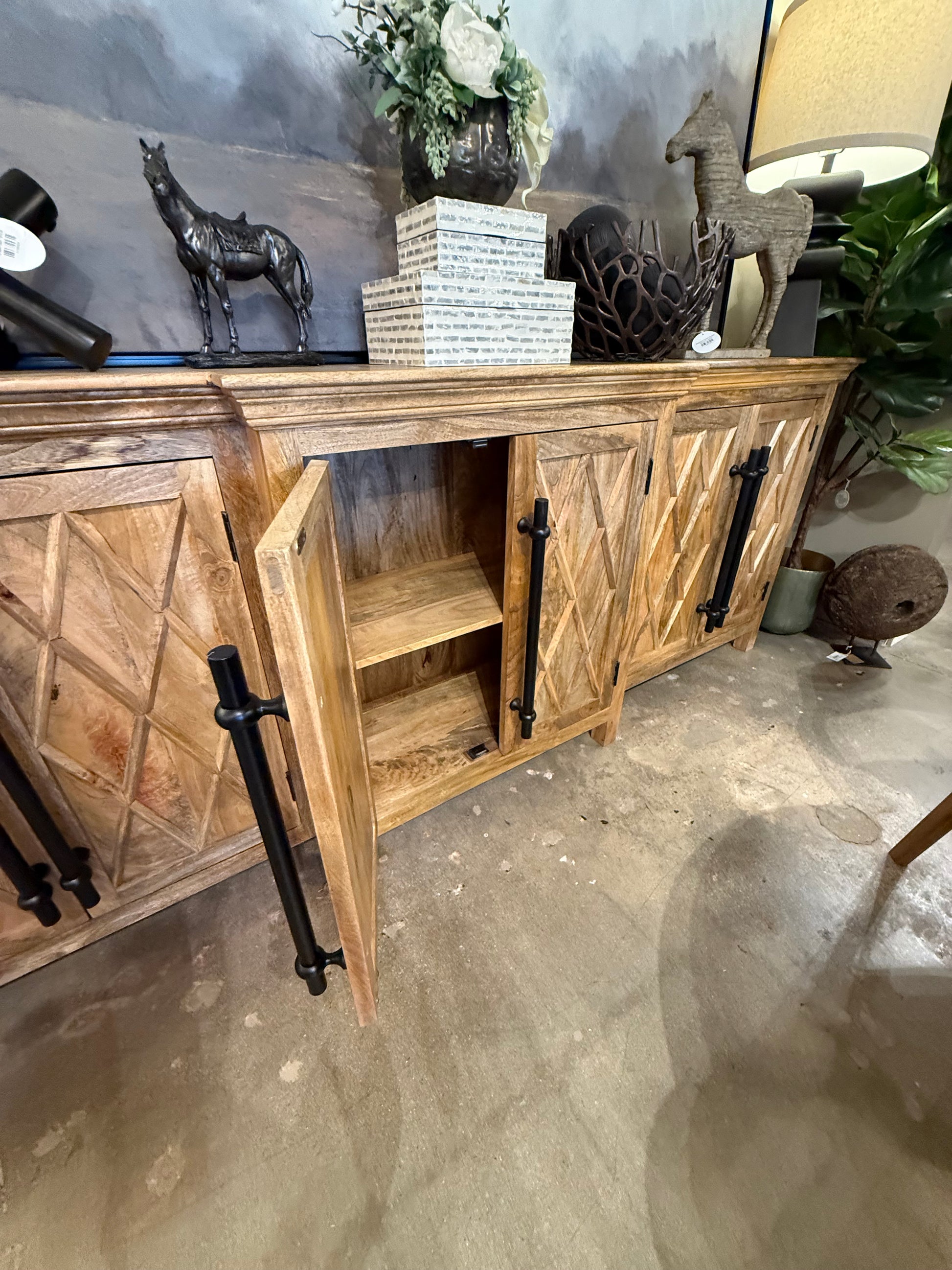 The natural Leah Extra Long Breakfront is a transitional show-stopper made from solid mango wood with oversized black hardware. With a spacious top and shelves, this exquisite statement piece offers tons of storage!