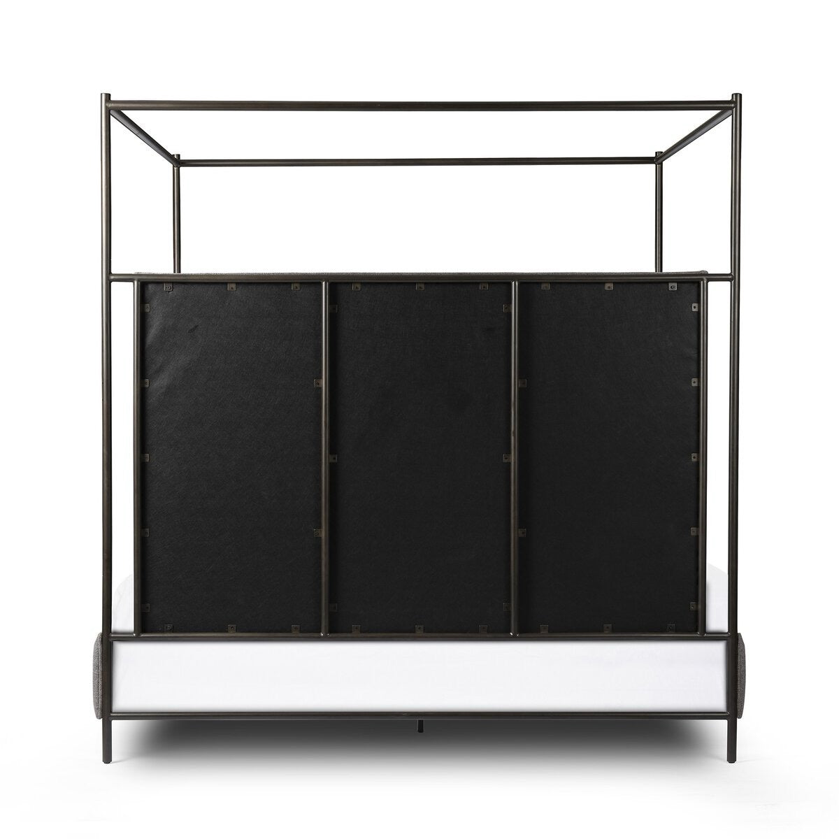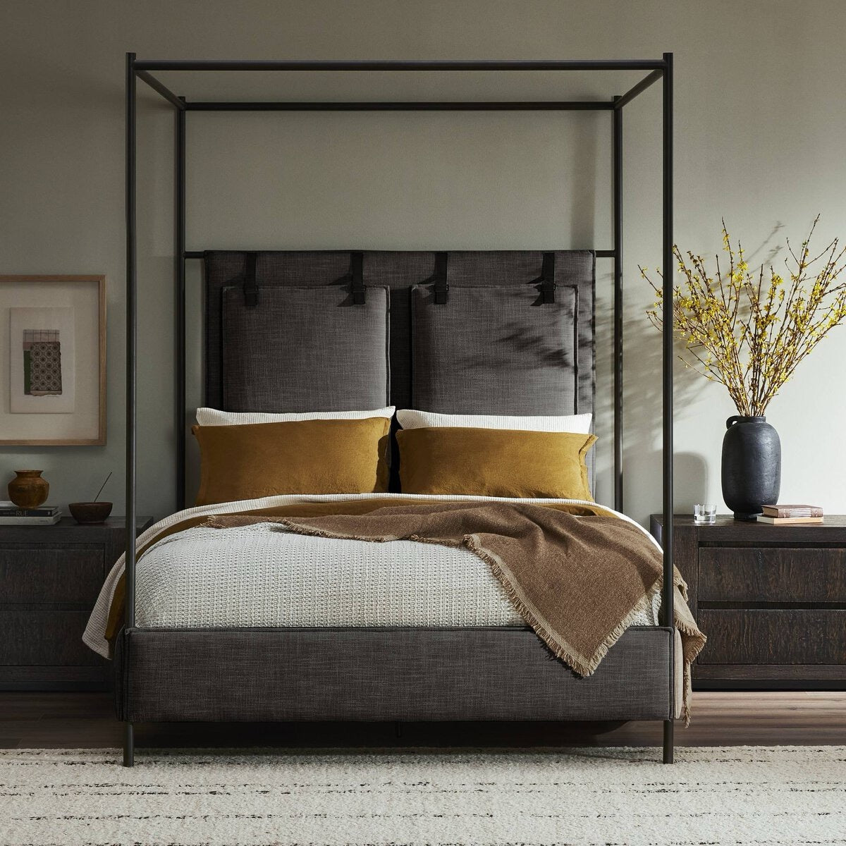 Safari styling gets refreshed with ash grey fabric and leather straps that secure decorative suspended headboard pillows. Box spring required.