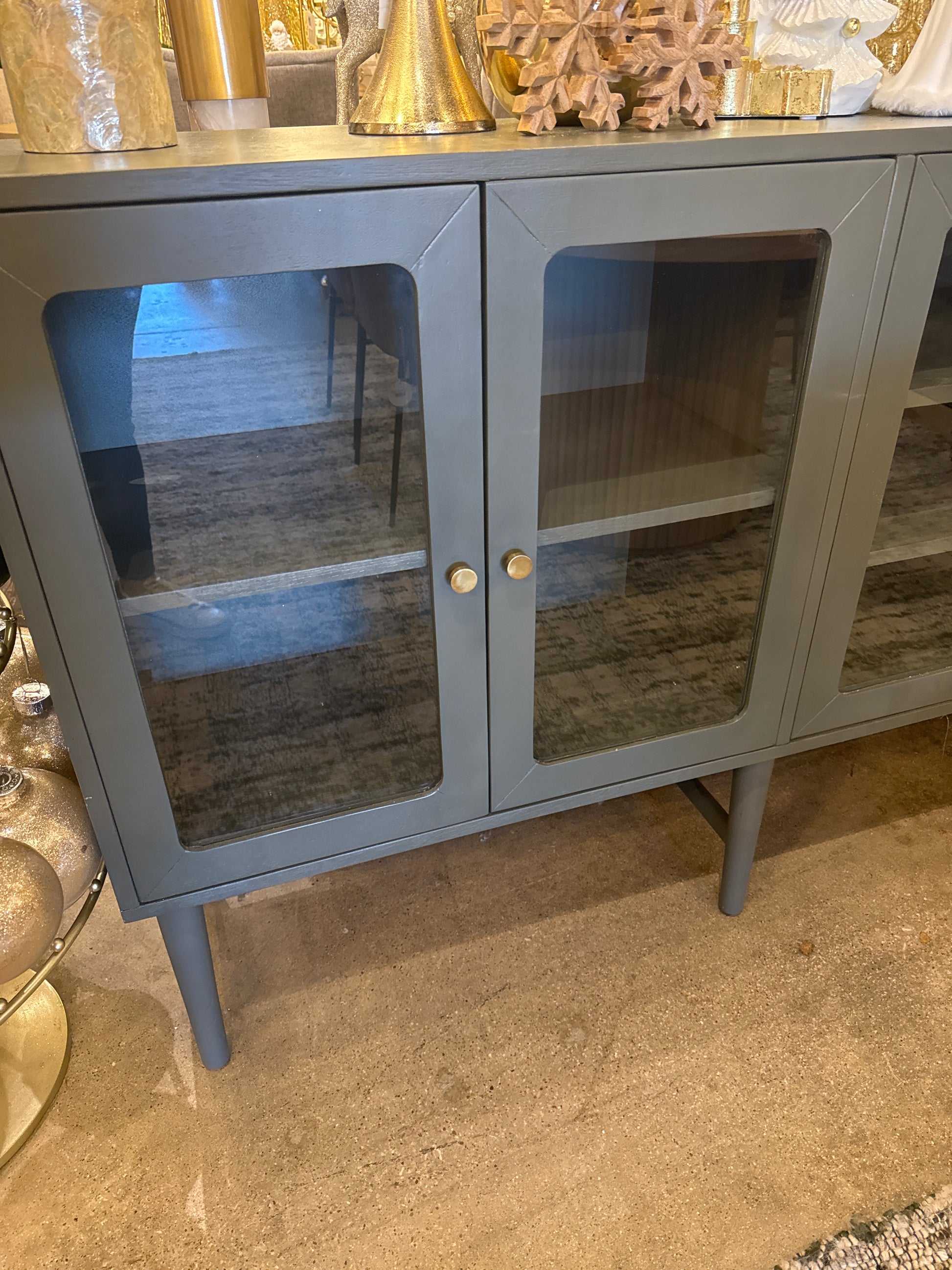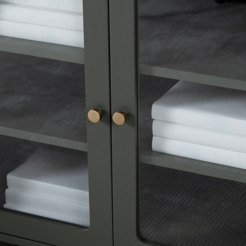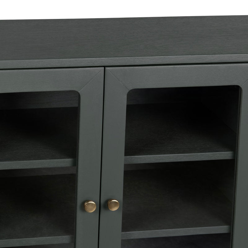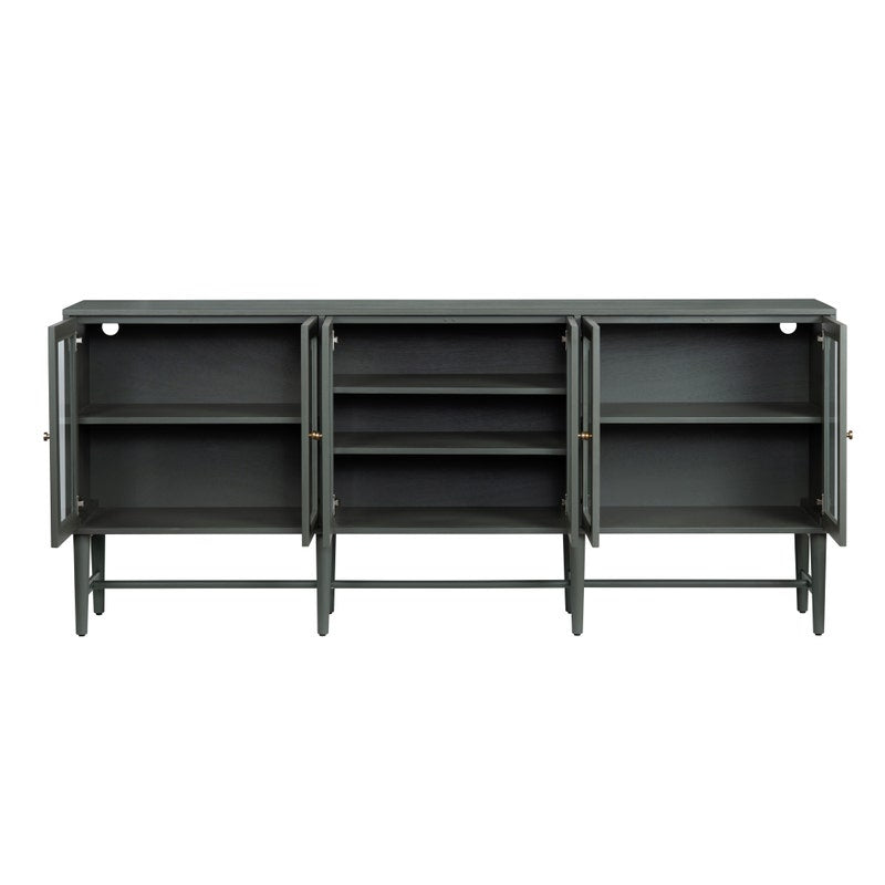 This green wood sideboard showcases a transitional style with six doors and multiple shelves, combining elegant design with functional storage.