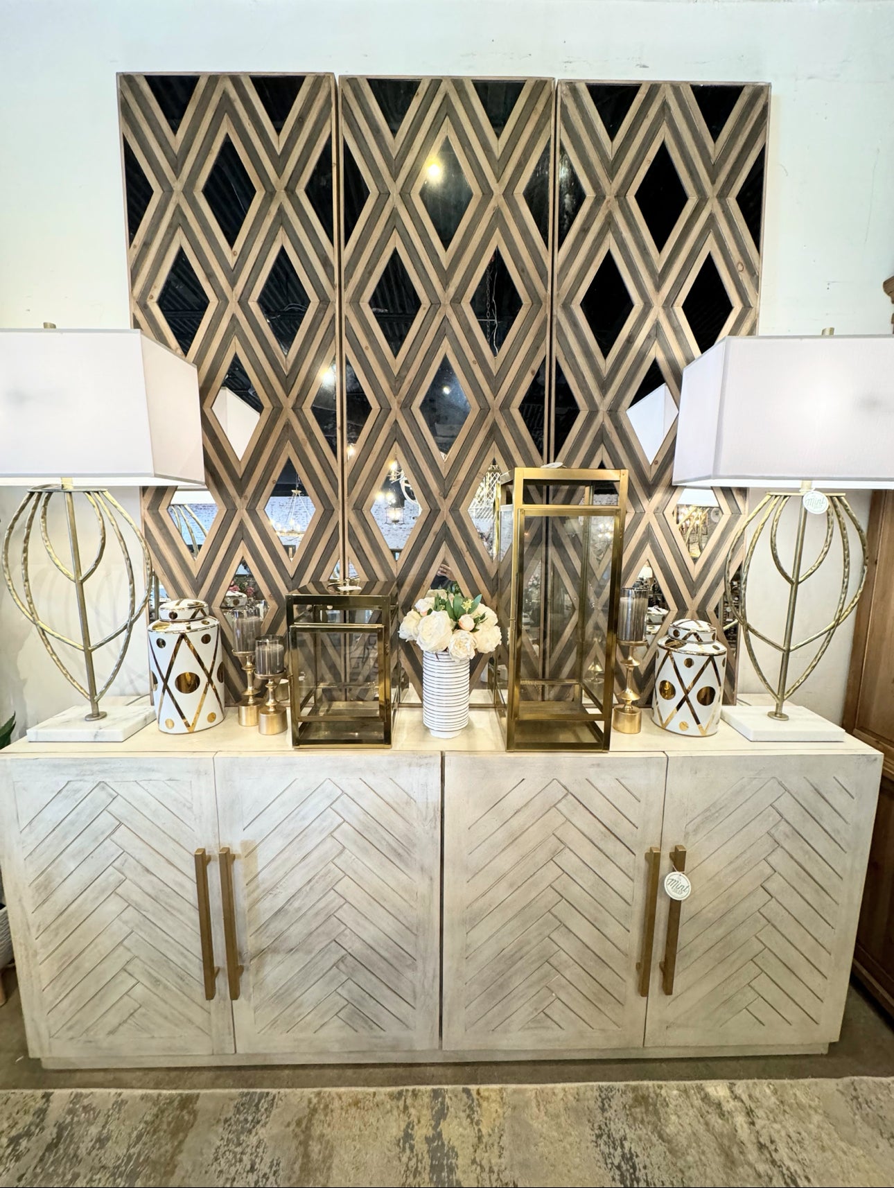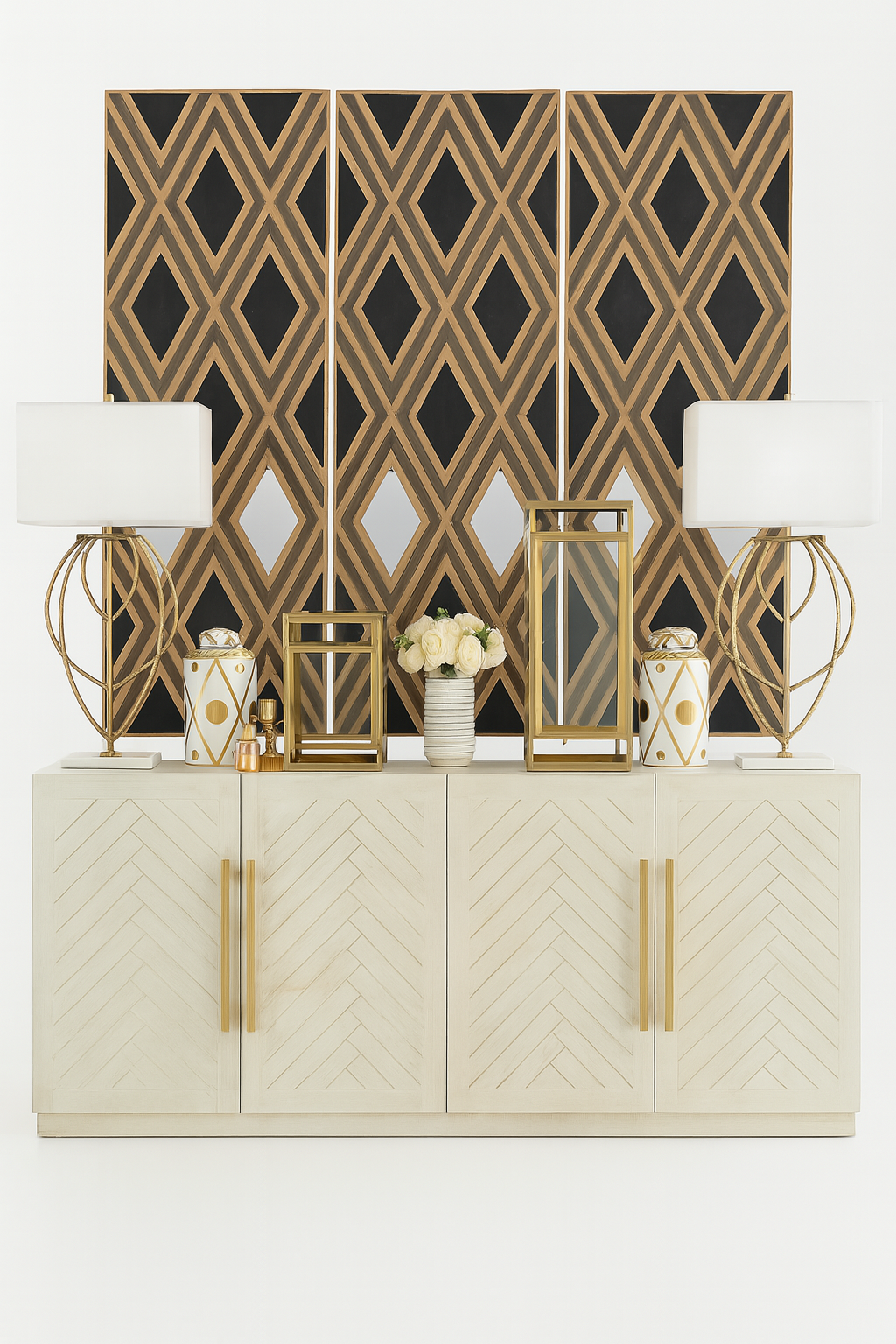 This stunning console table adds a touch of modern sophistication to any space. Crafted from solid mango wood with a white finish, this console is highlighted by its beautiful herringbone pattern and gold hardware, creating a luxurious centerpiece for any room.