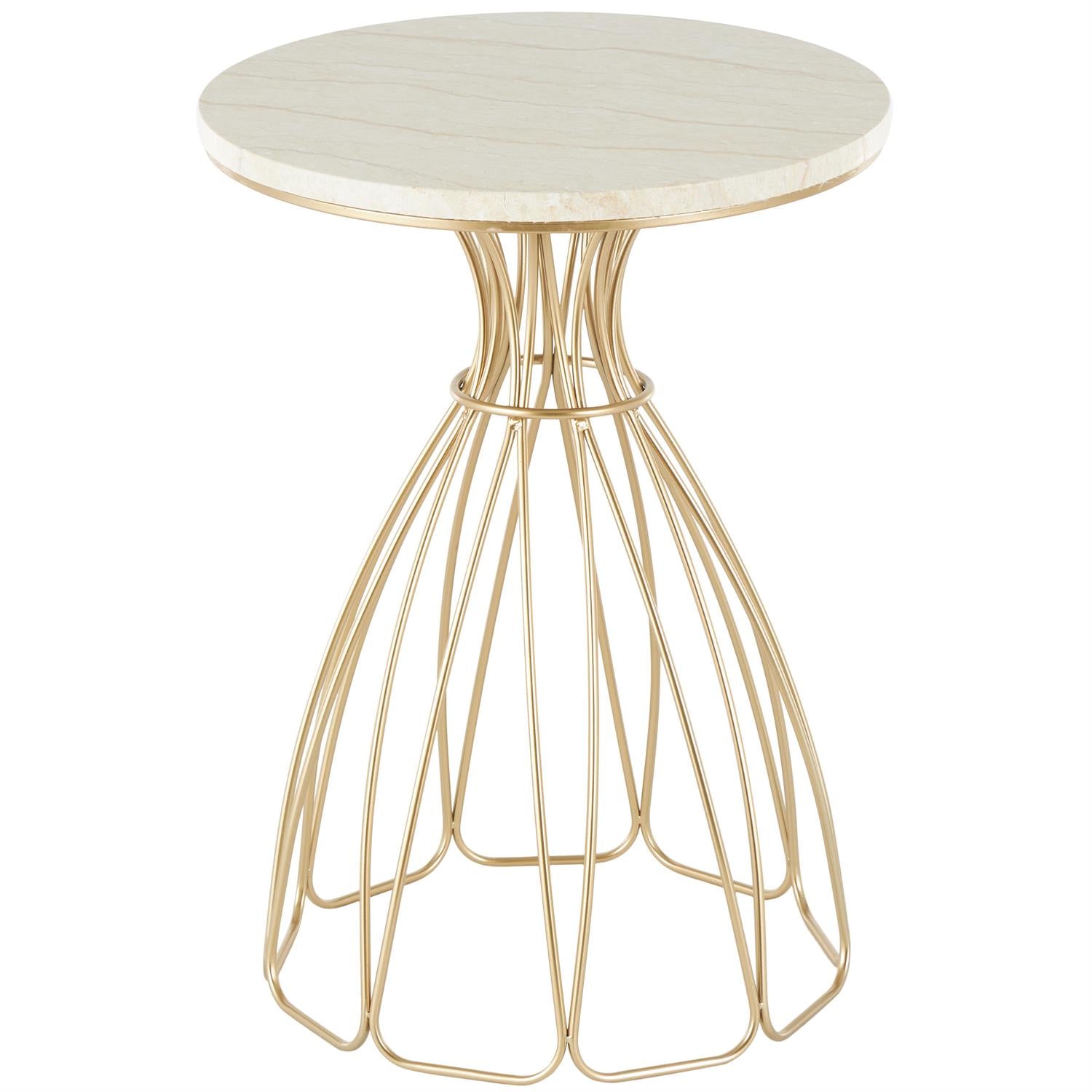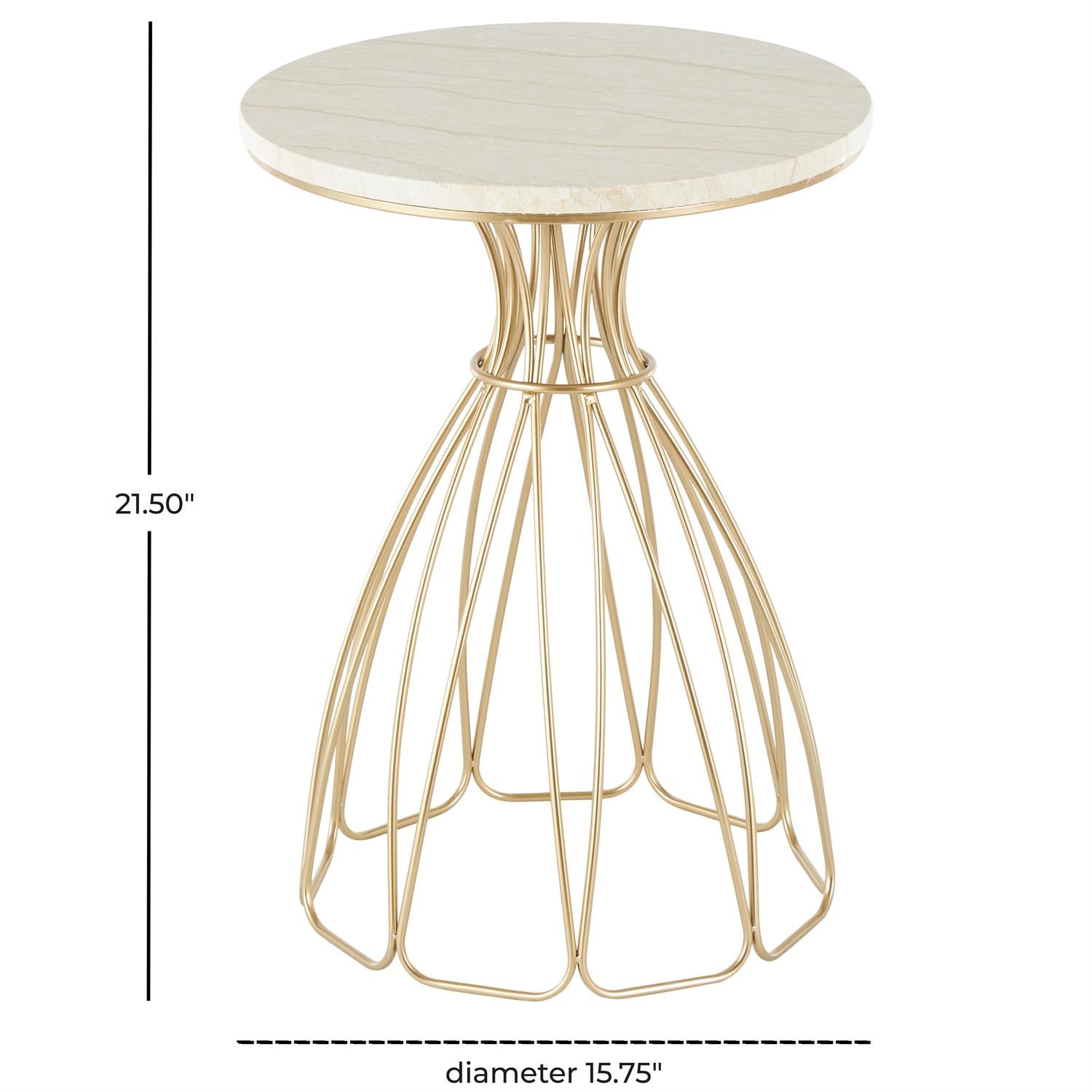 This metal round table features a sophisticated matte gold finish paired with a cream-colored tabletop, bringing an elegant atmosphere to any room. The contemporary metal accent table is distinguished by a distinctive flower-inspired design and a marble tabletop, enhancing its artistic and refined appearance.