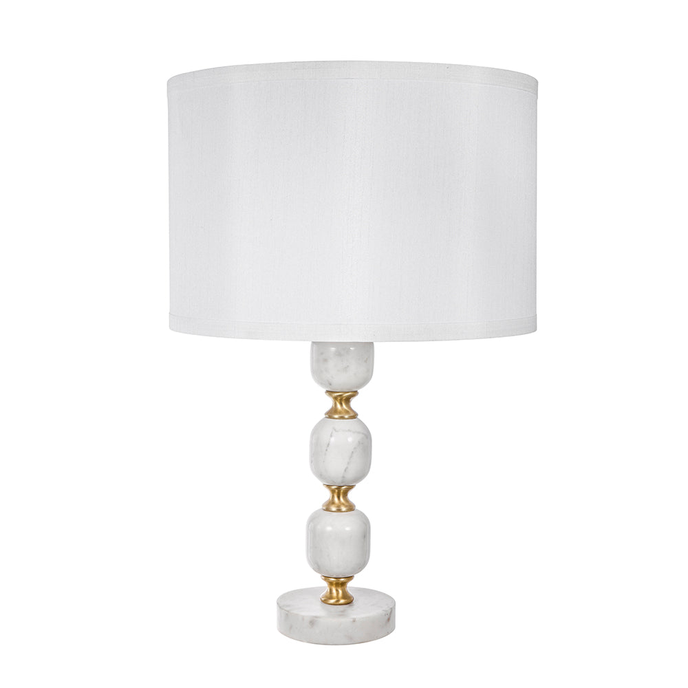 A timeless blend of texture and elegance, this lamp features stacked marble spheres wit gold accents and a crisp white drum shade.