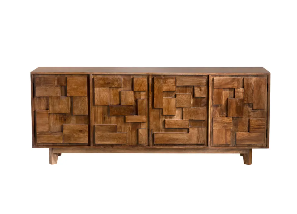 The McKenzie Sideboard features a distinct blocky pattern crafted from richly grained mango wood, combining durability with natural beauty. Its sturdy construction offers ample storage while the geometric design adds a modern architectural touch, making it an ideal centerpiece for sophisticated living spaces. Expertly built for both style and function, this sideboard blends timeless craftsmanship with contemporary appeal.