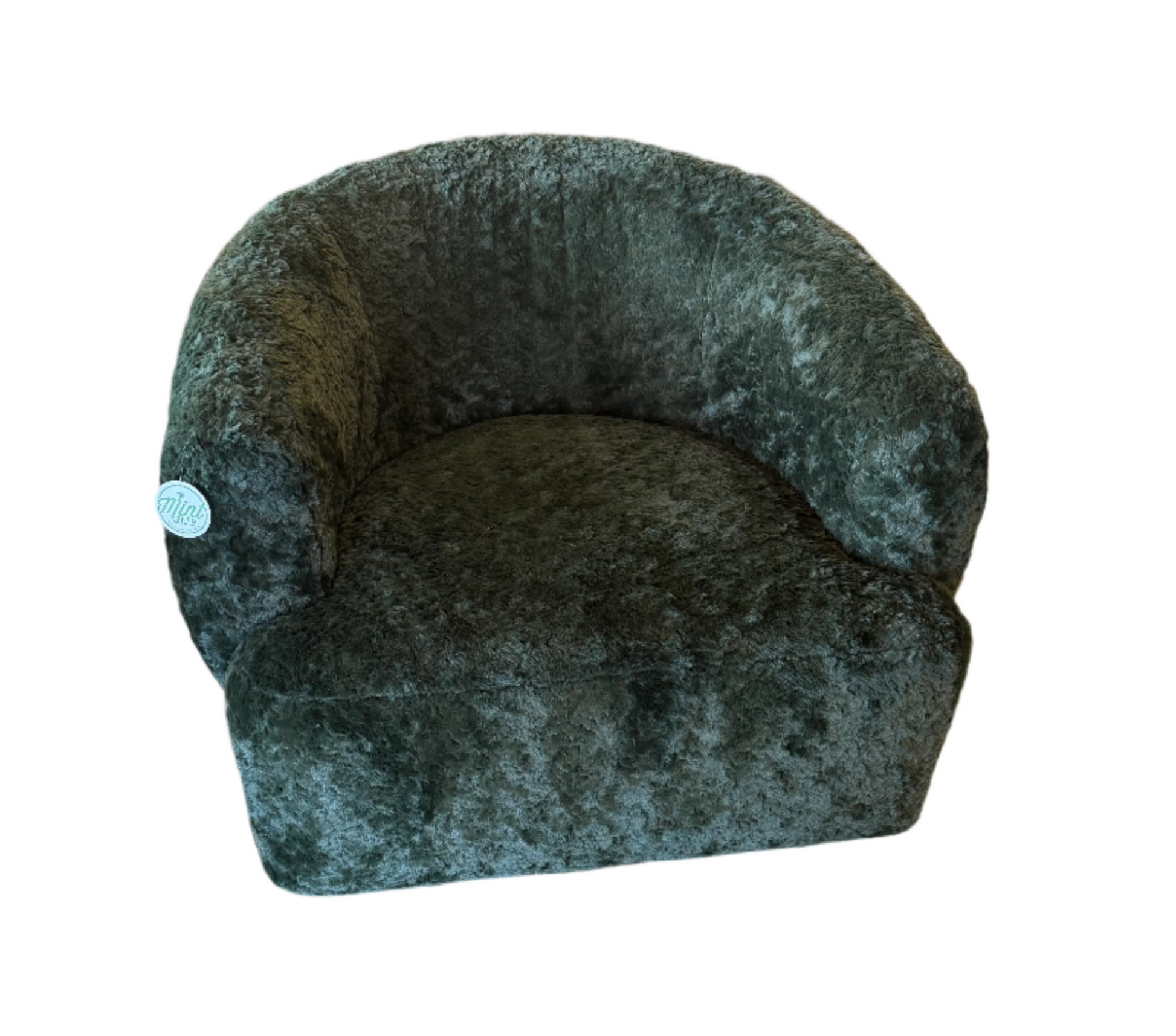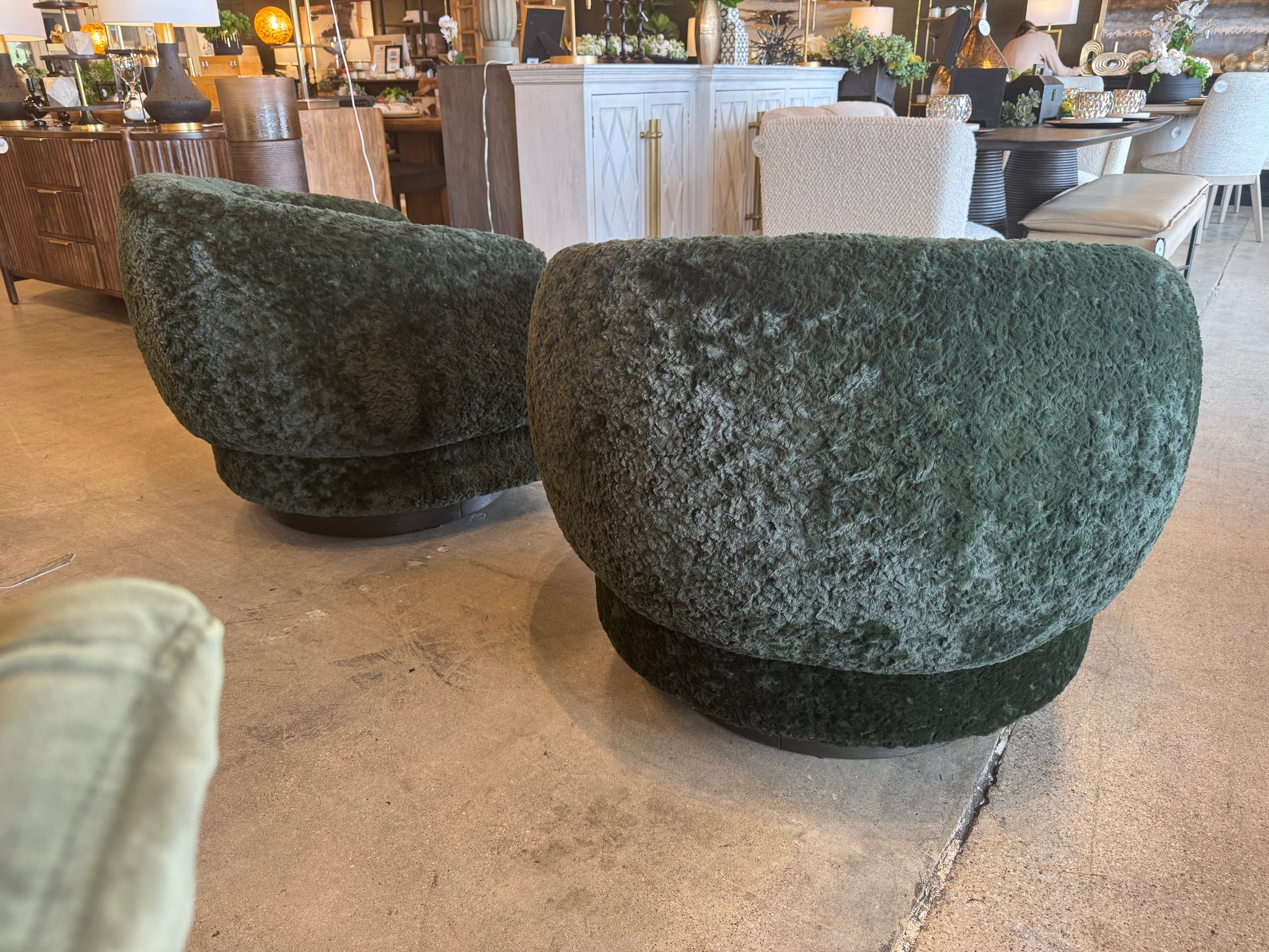 The Nia Swivel Chair, upholstered in soft Mystery Moss fabric, features a durable solid oak frame with a modern dark cinder finish. Its 360-degree swivel function makes it versatile and comfortable for any space. Enjoy a cushy seat while adding a touch of sophistication to your room.
