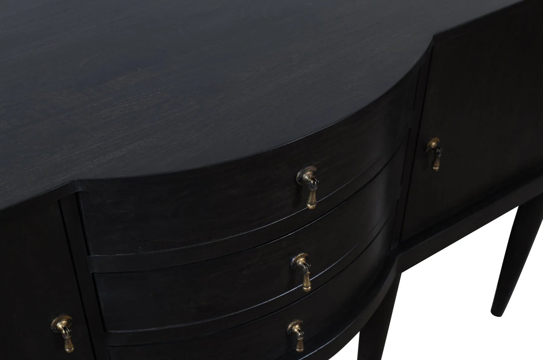 The Noah Console blends classic elegance with practical storage, featuring a gracefully curved front, tapered legs, and antique-inspired tassel knobs. Its black finish enhances the rich character of the design, while a trio of spacious drawers and side cabinets, it provides both functional storage and an eye-catching design. Perfect for entryways, dining rooms, or living spaces, this console adds a sophisticated touch to any setting.