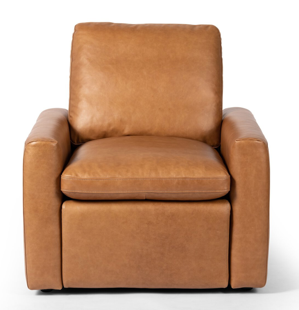 A modern take on the traditional recliner chair. Customize your comfort level with the push of hidden buttons with pieces in our Power Motion collection. Recliner features a slightly higher seat and backrest, low, sleek arms, and a motion footrest. Plush feather-blend cushions create a relaxed look and feel. Fluff cushions regularly to maintain appearance. Zero-clearance design means the chair can be placed up against a wall. Upholstered in our exclusive top-grain leather with slightly distressed character. Includes 9'5" power cord. There is a six-motor maximum per power outlet. Each motor comes with a two-year warranty.