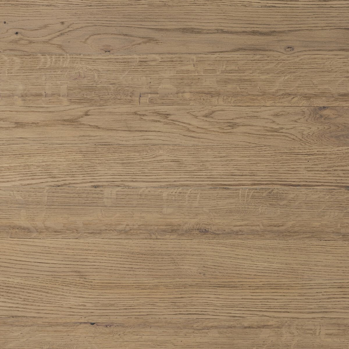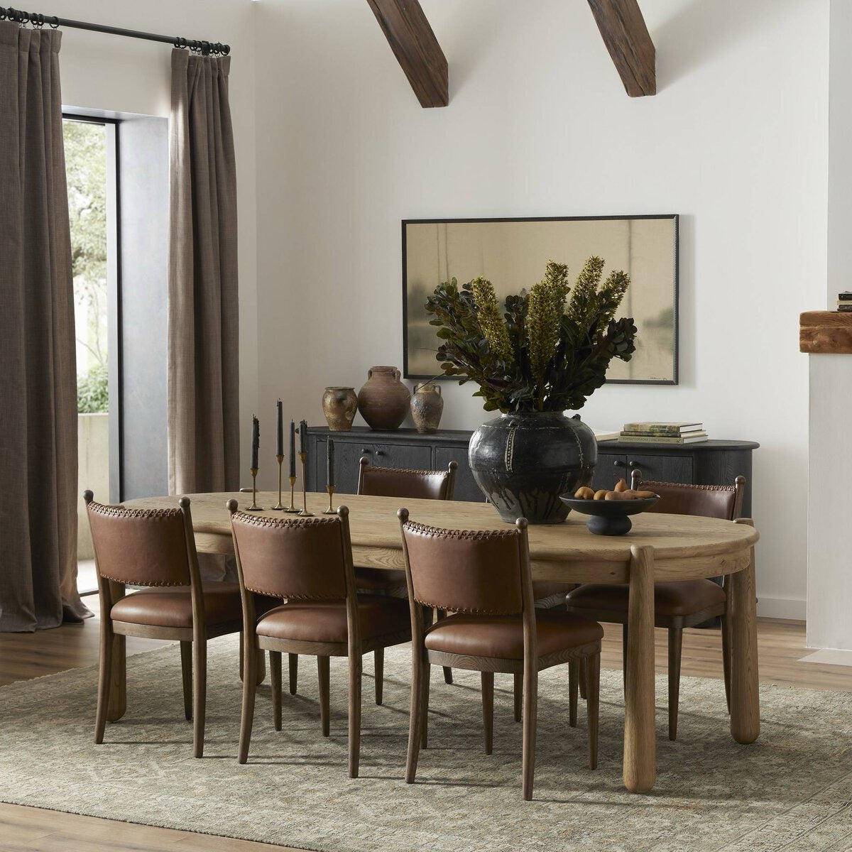 A study in simple detailing. Tapered legs pull through the pill-shaped top of this smoked oak dining table, with the rich knots, cracking and grain adding character! This gorgeous dining table will last for generations to come!