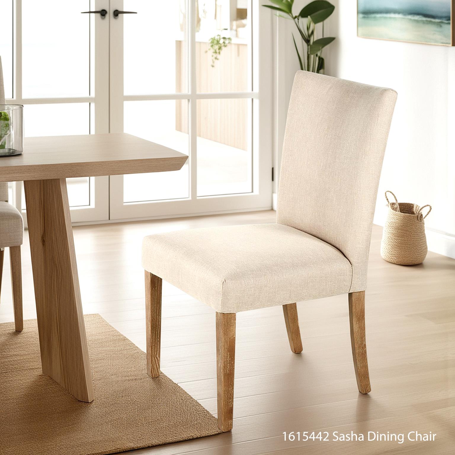 The Sasha Dining Chair adds a modern-rustic element to any dining room. Upholstered in a biscuit linen fabric, this chair provides an inviting look with its grey-washed acacia wood frame. Its lightweight structure and durability make it perfect for everyday use.