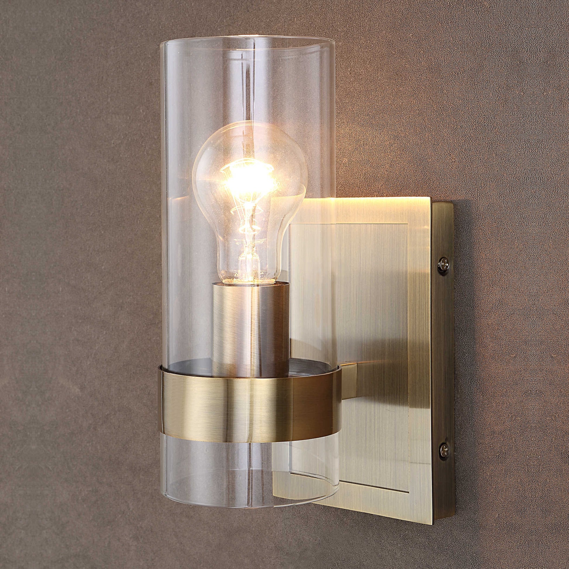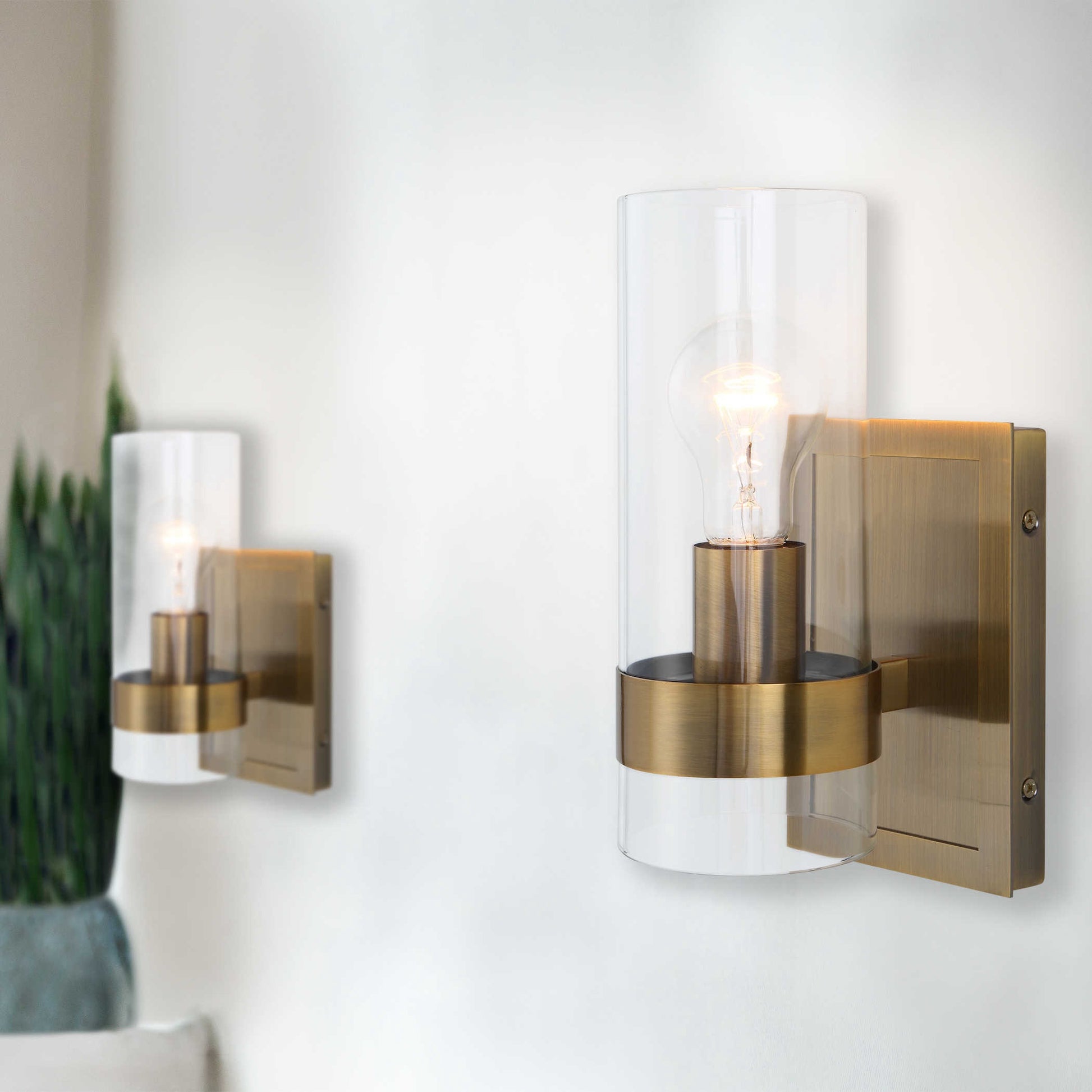 Clean modern lines enhance this 1 Lt. sconce featuring a wide ring holding the clear cylinder glass yielding a floating effect, finished in a warm oxidized antique brass. 1-60 watt max, Edison socket. Bulbs not included.