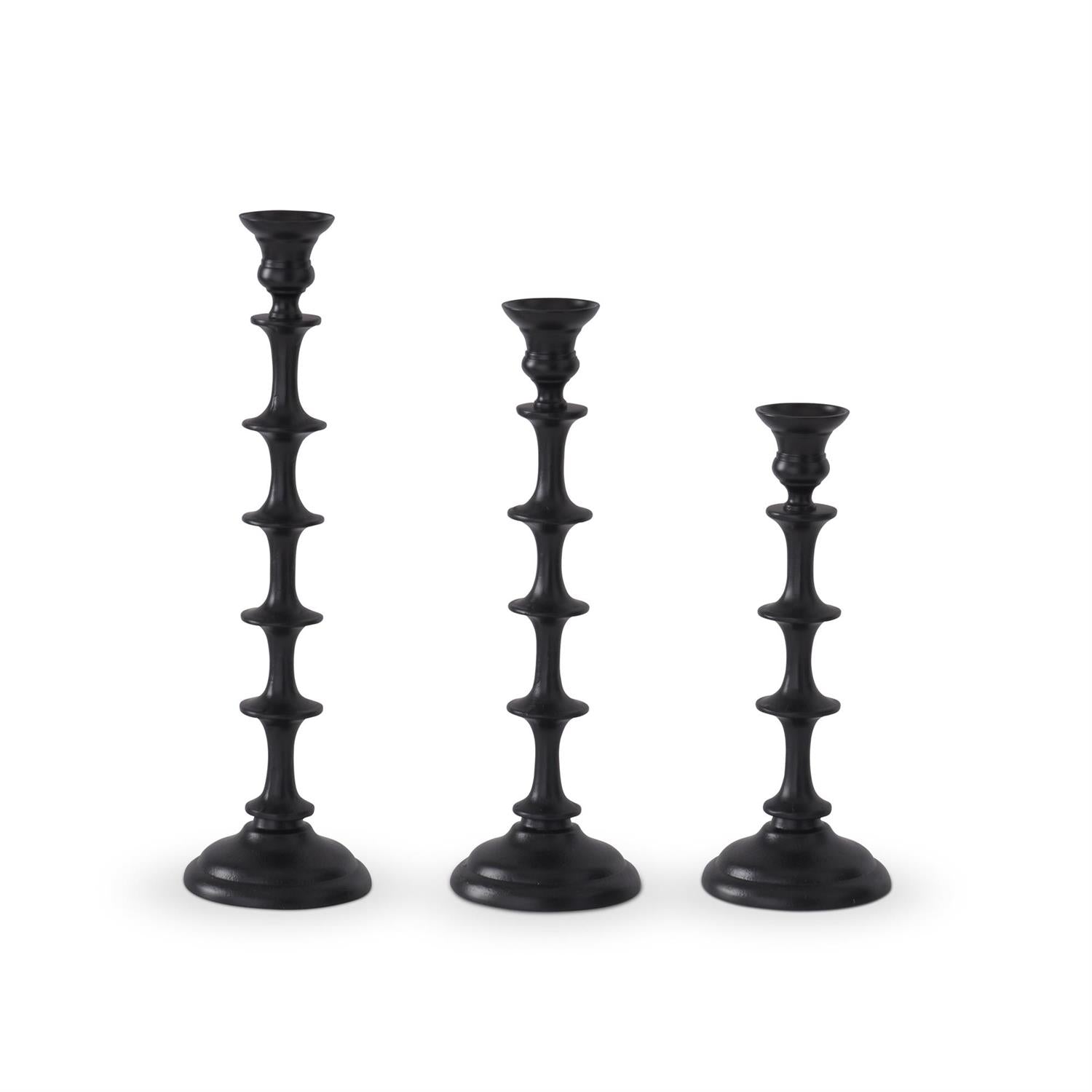 This set includes three elegant black metal taper candleholders, perfect for adding a touch of sophistication to any space.