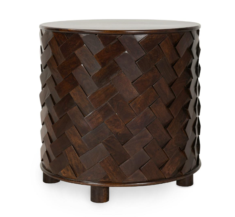 Mango Wood Brown Finish Geometric Pattern Ventilation Holes Round Legs Adjustable Levelers It features a beautiful mango wood brown finish, ensuring that it complements any decor. The geometric pattern adds visual interest, while the ventilation holes keep the air flowing. Its round legs are sturdy and stylish, and the adjustable levelers ensure stability on any surface.