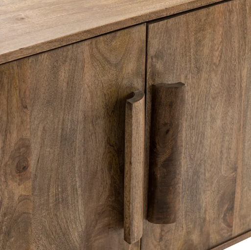 Our Sydney Sideboard is made of solid wood and has a dark-brown finish that adds warmth to your home. Four doors open to two cabinets with large wooden handles. The modern style of this versatile piece will complement the decor in your living room, dining room or hallway.