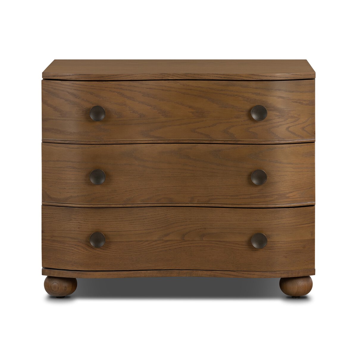Elevate your bedroom with the Tigue Solid Oak Nightstand. Crafted from solid oak and finished in a toasted oak stain, this nightstand offers ample storage with 3 drawers and oversized hardware. Its unique curvy front, inspired by European antiques, adds a touch of elegance. Invest in a piece that will last for generations. Style and storage galore!!