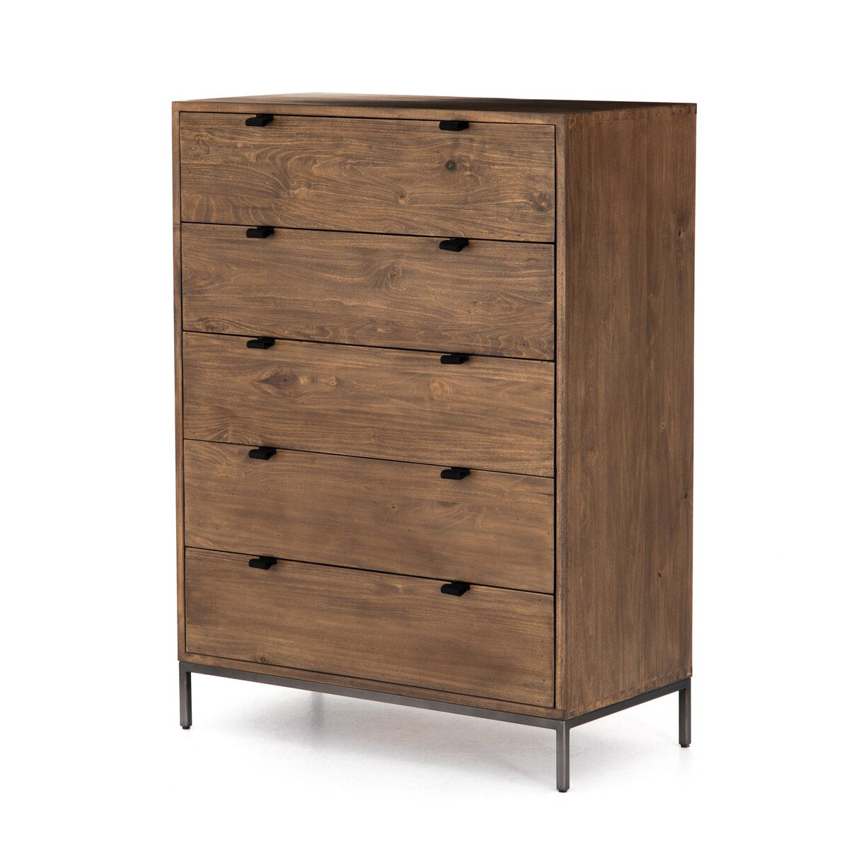 Inspired by clean mid-century design, a stylish dresser of auburn poplar offers plenty of bedroom storage space thanks to five spacious drawers. Metal-secured leather pulls add a textural element of surprise.