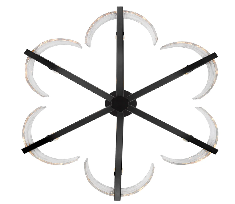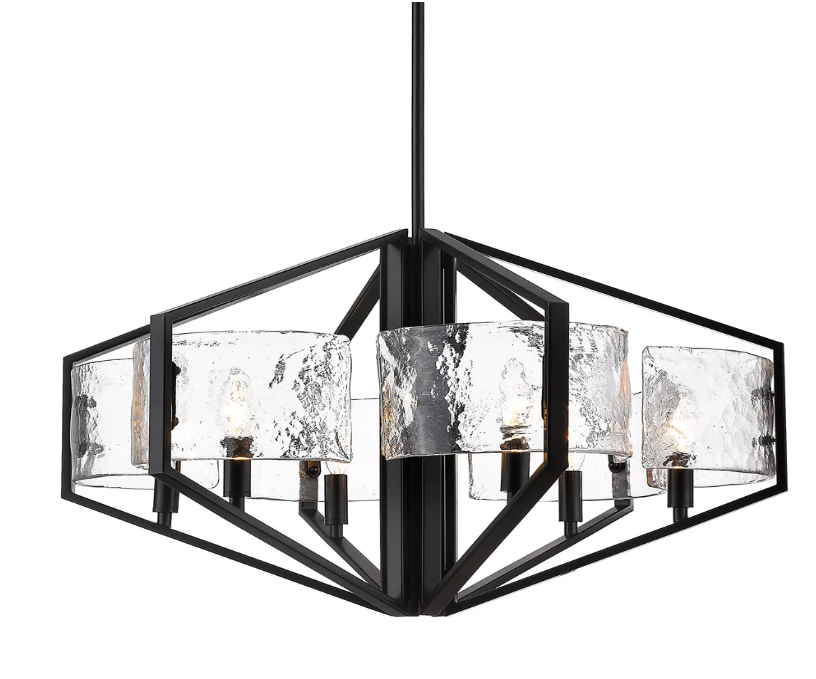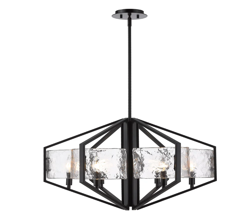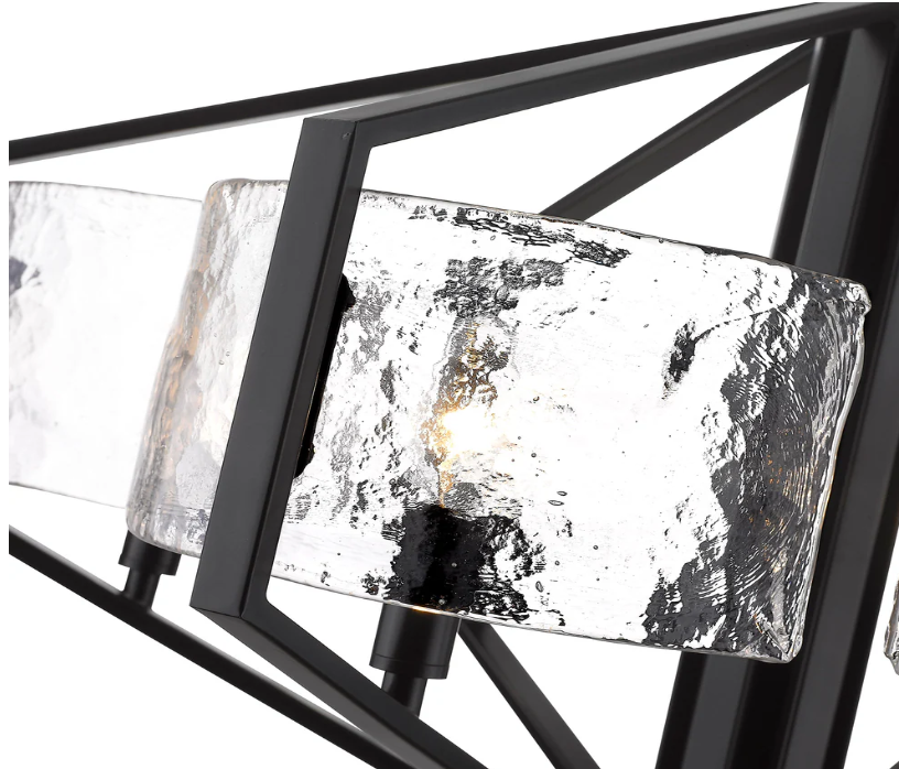 The beauty of water is the inspiration behind the contemporary Varsha collection. Create a relaxed mood with this modern interpretation of refractive water. Drift on the waves of the thick artisan glass with no worries of being swept away by a current. Strong geometric arms carry the Hammered Water Glass while veiled screws hold the panels in place. The frame’s repetitive boxes converge to create a center column. Strong candelabras sit upon wide cups that are partially concealed behind the beautiful glass. The smooth matte black finish offers a sophisticated feel. This large pendant is ideally sized for a dining room or large foyer.
