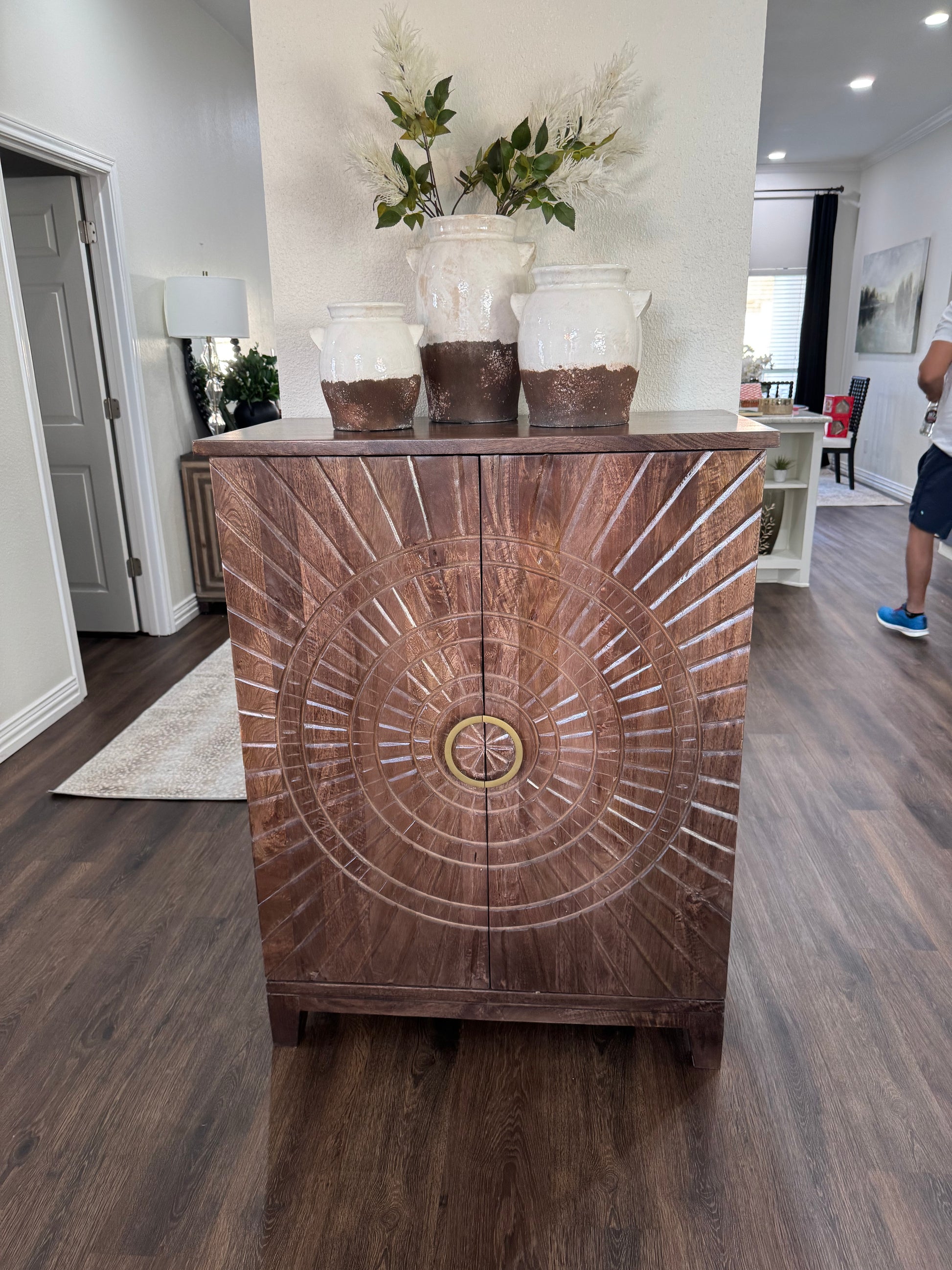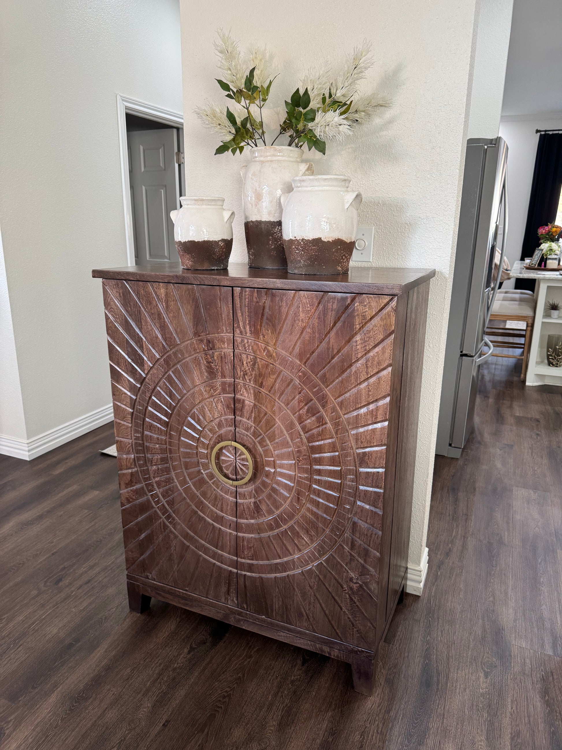 Expertly crafted with handcarved doors, this Vivienne Bar Cabinet in Brown features a convenient stemware rack and spacious wine cubbies for bottle storage. The adjustable levelers ensure stability, while the use of mango wood adds a touch of warmth and durability.