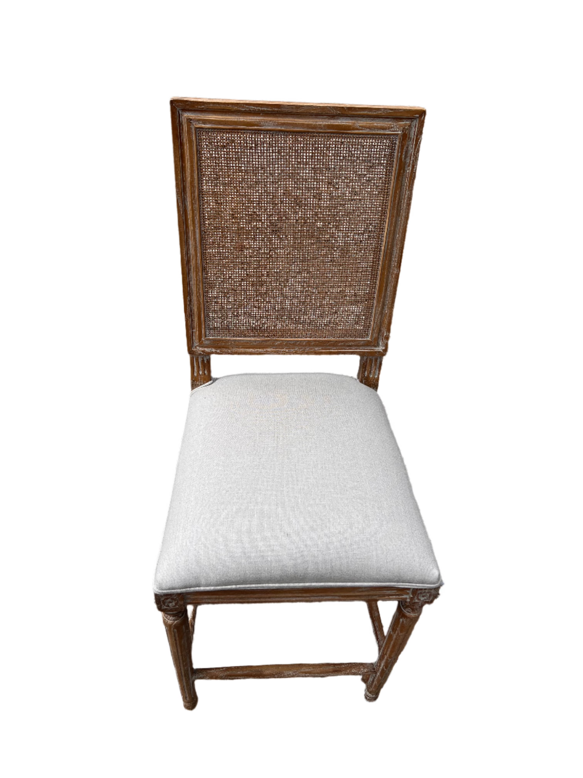 Elegant lines and a lightly whitewashed wood finish are the hallmarks of our linen barstool. 100% solid oak hand carved frame and 100% linen upholstery! This is a fabulous transitional style that dresses up or down. Matching armchairs available.