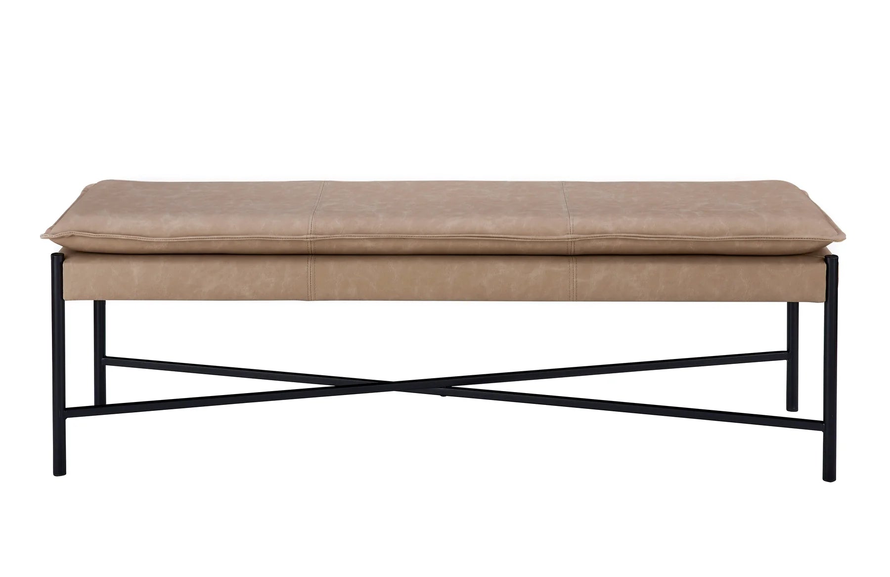 Our Micah Bench Created in our mushroom leather, this bench's seat has a bench seat cushion on top of it. It adds a differentiated look to this neutral piece. It is finished off with its matte black straight rods at the legs.