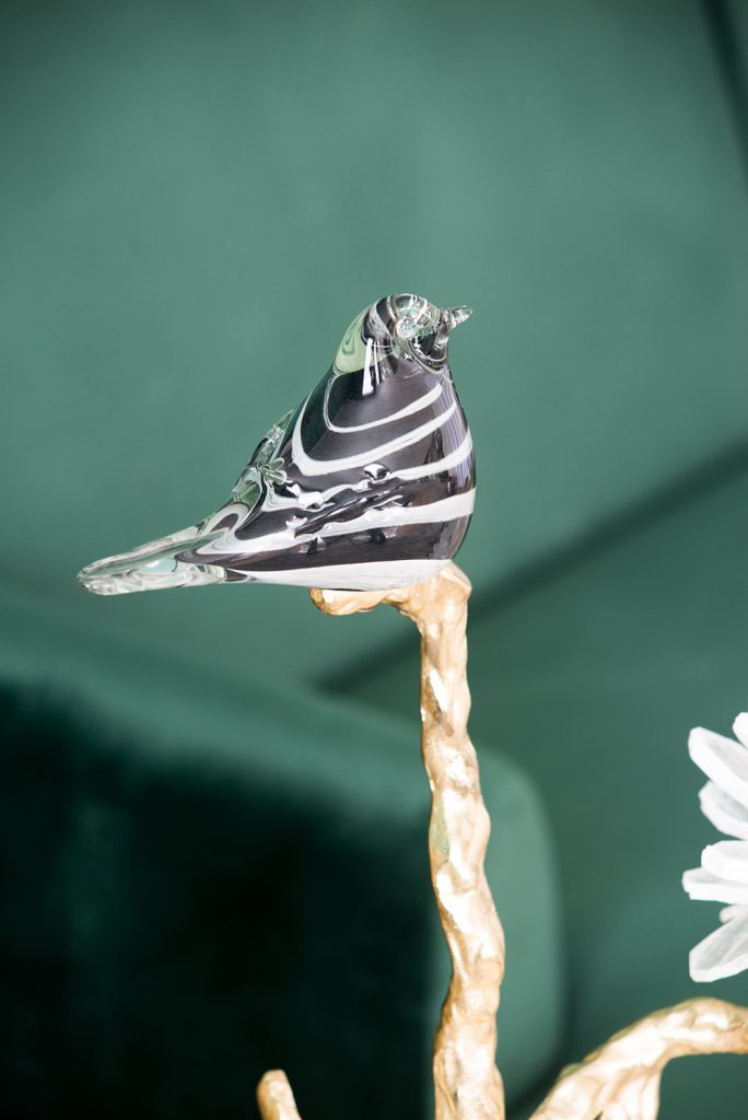 Constructed with a blend of materials such as marble, selenite, and glass, this exquisite figurine showcases a black bird perched on a shiny gold branch adorned with delicate white detailing. Perfect for adding a touch of nature-inspired sophistication, it can serve as a transitional decor piece for entryways, living spaces, or an office desk, or as a metallic accent on a dining room tablescape.
