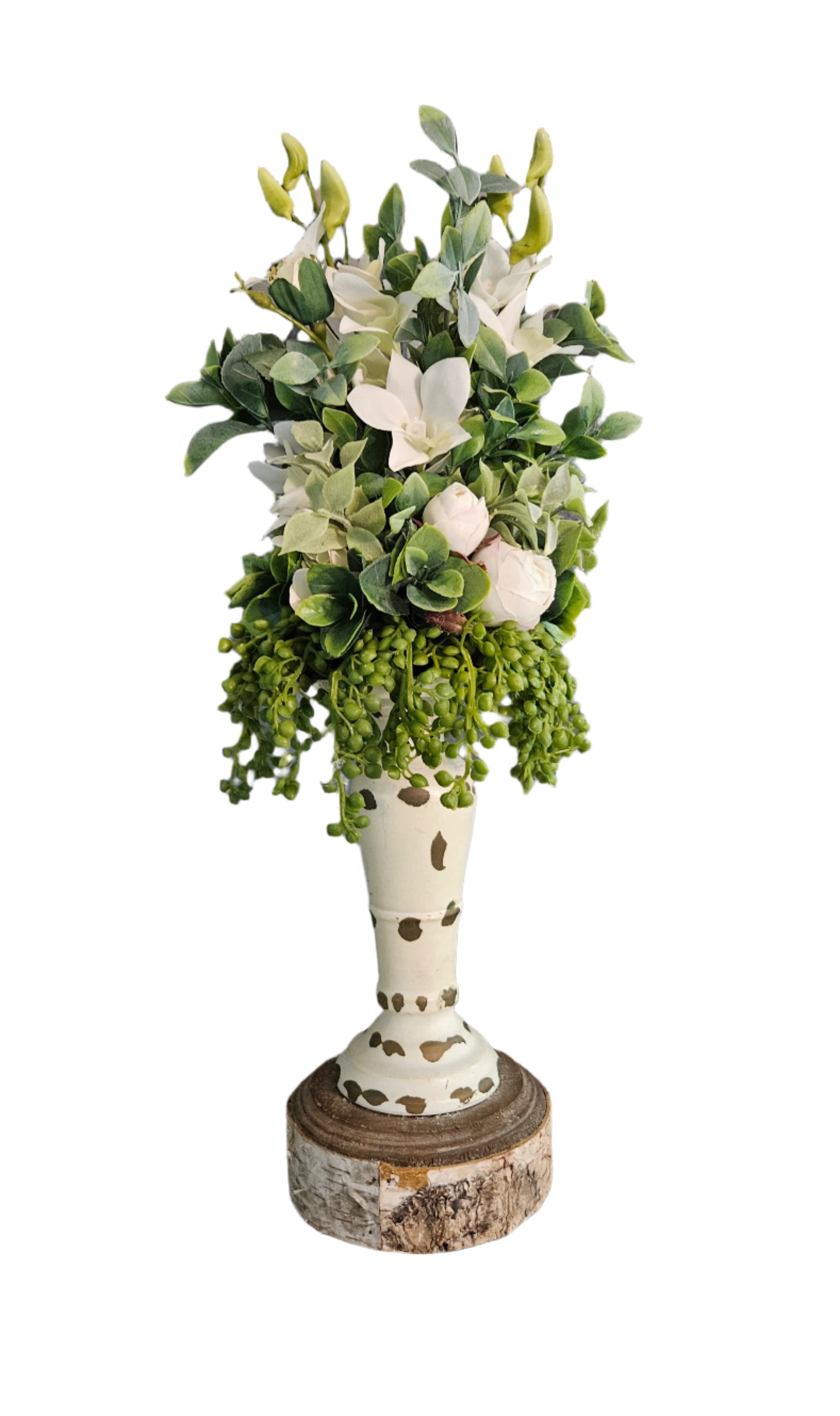 This removable arrangement is designed with cream real touch small orchids, roses and hydrangeas.