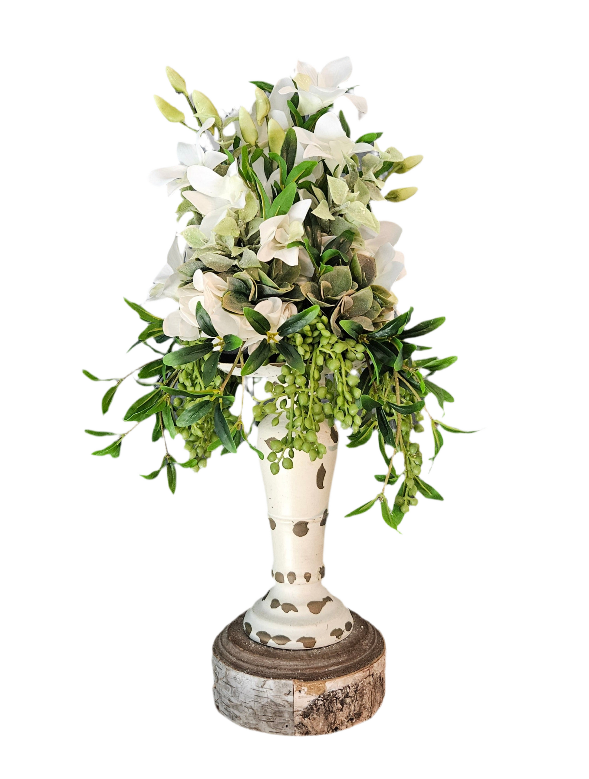 This full topper is designed with real touch small cream orchids and assorted greenery.